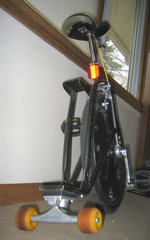 We call this a uniskate for lack of a better term. It is unlike anything we’ve ever seen. Unlike the LeRun skate bikes that have the skateboard truck in the front and are chain driven, this vehicle has the skateboard truck in the back and the drive is direct like a unicycle. The uniskate has a 20" wheel and brakes and overall is decent shape. It is a real attention getter at club meetings and parades and is quite popular with children.