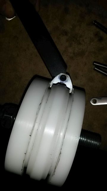 Die Kugellager setzen wir in die Mitte der POM Rohlinge. Es mag aber auch ohne Kugellager gehen, d.h. nur ein Loch durch die POM Stücke bohren. Es macht anscheinend nichts aus, wenn das Loch einiges größer ist als die M16 Gewindestange.