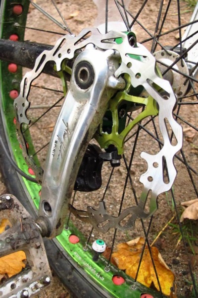 I have a 180mm disk on my Muni, on Spirit cranks. My disk is really out of true, but it’s easy to pull back. I’m probably going to change my disk(s) on all my setups for fancy floating disks, hopefully they’ll stay straight for longer.