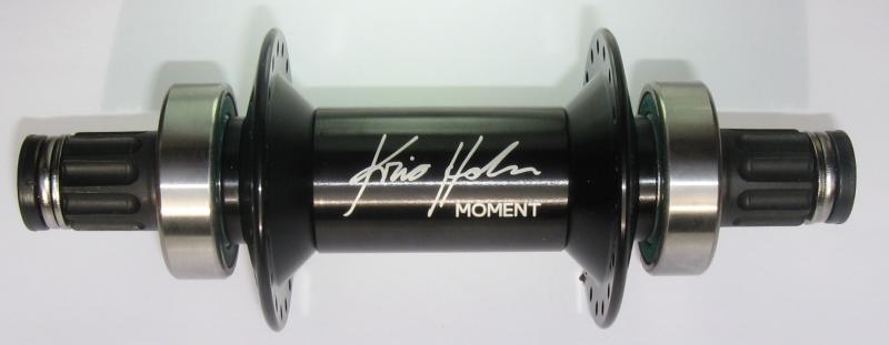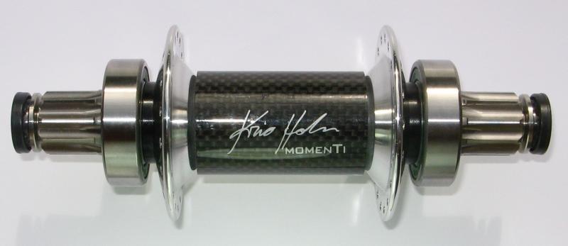 Redesigned Moment hubs (both Ti and CrMo; photos attached). Hub flanges are now machined 7075 aluminum, to increase strength and provide a better angle for spokes. Flanges are 36-splined and pressed onto corresponding axle splines, eliminating all welds (cranks are still ISIS). The hub body is hollow (except for the spindle); the CrMo version has a black aluminum body and the Ti MomenTi hub has a very beautiful glossy carbonfibre body. The CrMo version is very slightly lighter (32 g), and the Ti version is very slightly heavier (18g). In practical terms the weights are the same.