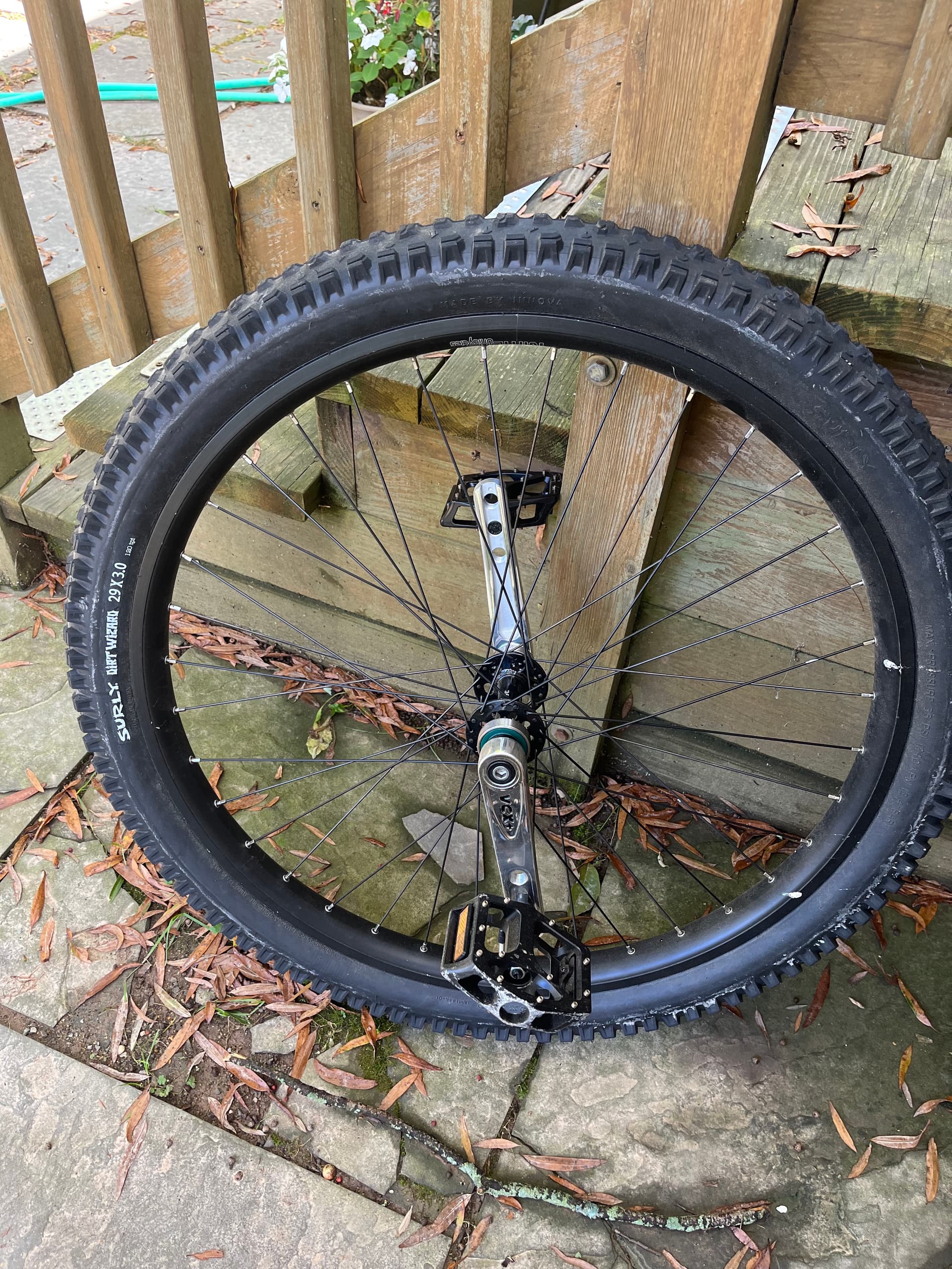 Finished with a Surly Dirt Wizard 29v3.0" tire. This wheel has VERY few miles on it. Better to go to a home where it will be ridden than hanging in the garage.