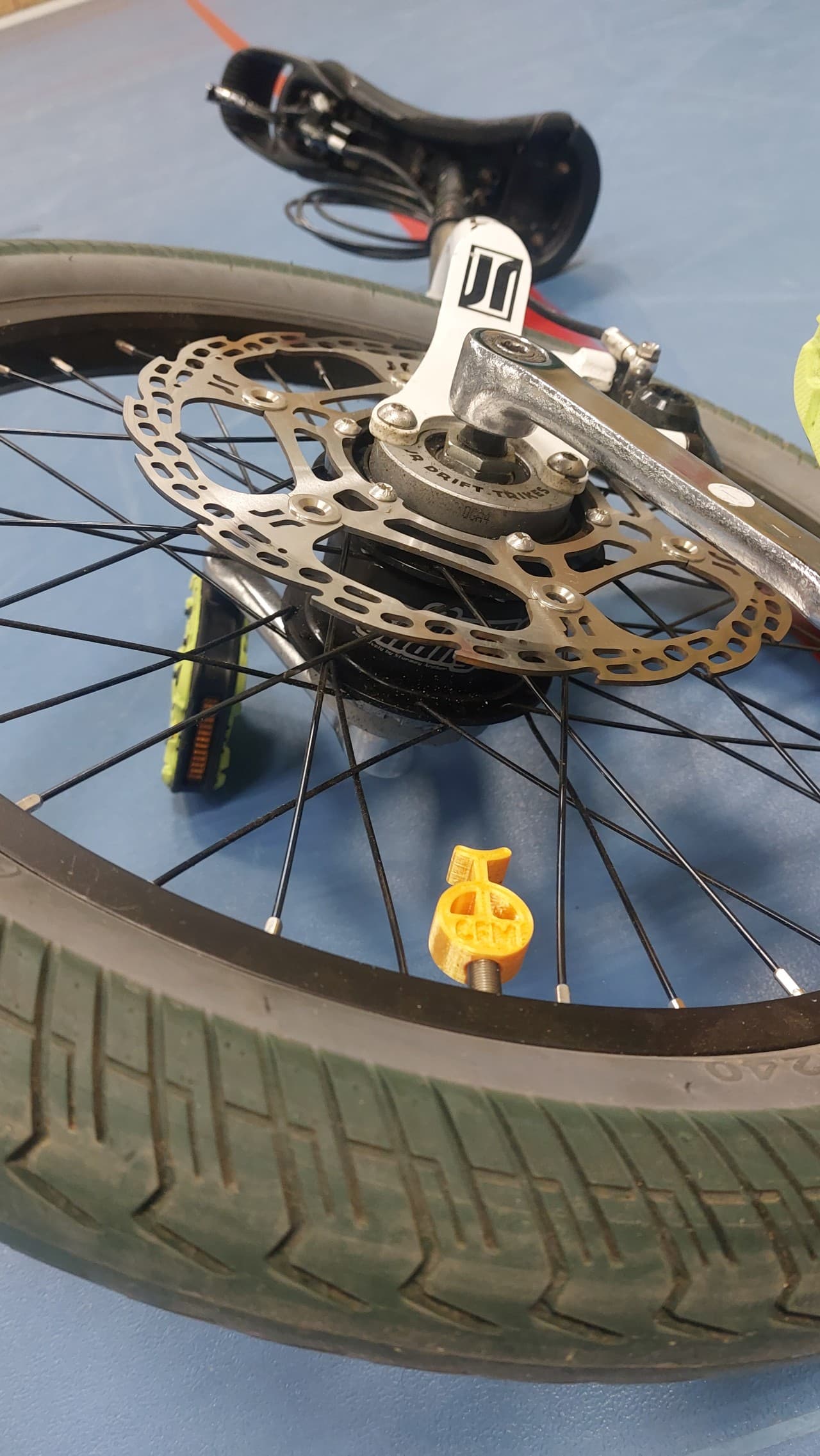 Thanks to @Maxence for the donation of the saddle and brake support. You’ll also see a magnificent collector’s gold valve cap that I won at CFM2024. And the famous plastic pedals (look trail grip) that I really like.