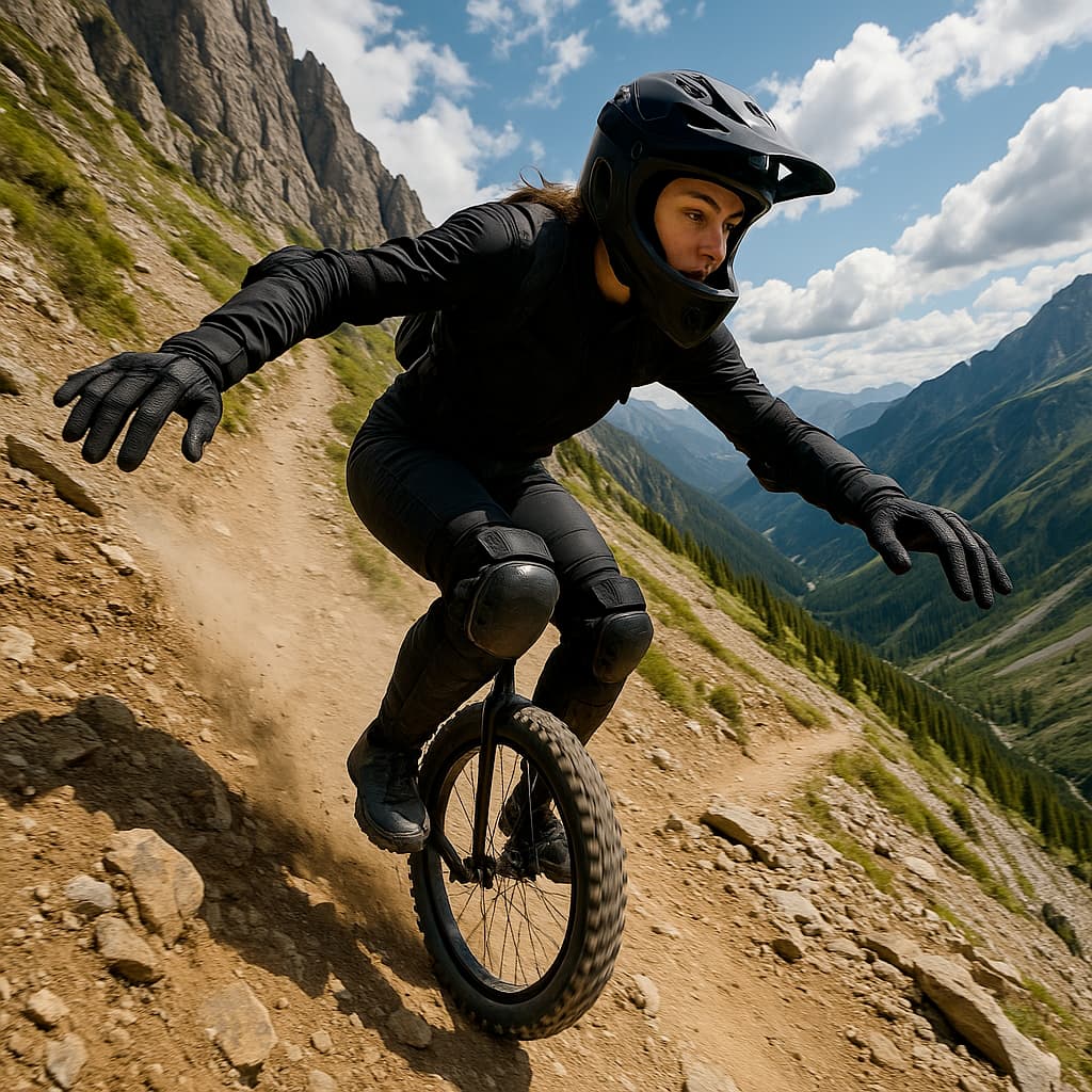 Output a picture of a man doing off-road unicycling, jumping over a hill during a muni competition. The picture is a sports photography taken with a high-end digital camera and a wide-angle lens, making the picture extremely dynamic. The unicyclist wears full protective gear and a helmet.