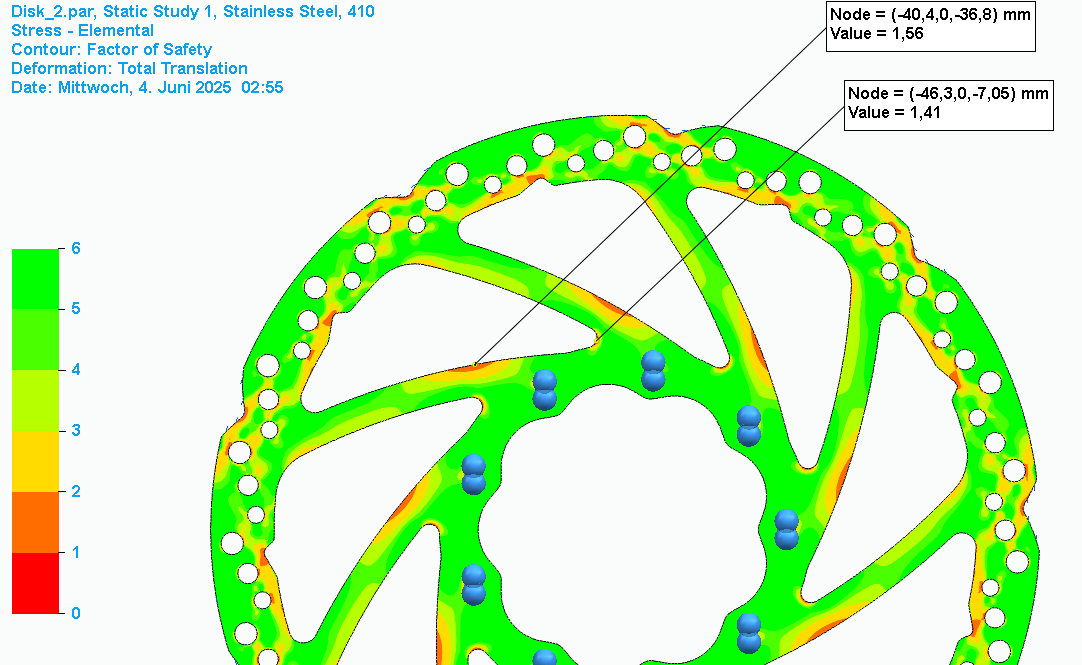 Does your FEM package allow analysis of thermal expansion? This I think is potentially our biggest problem. Do spokes of this size allow them to bend/flex with the expansion without distorting the brake surface?
