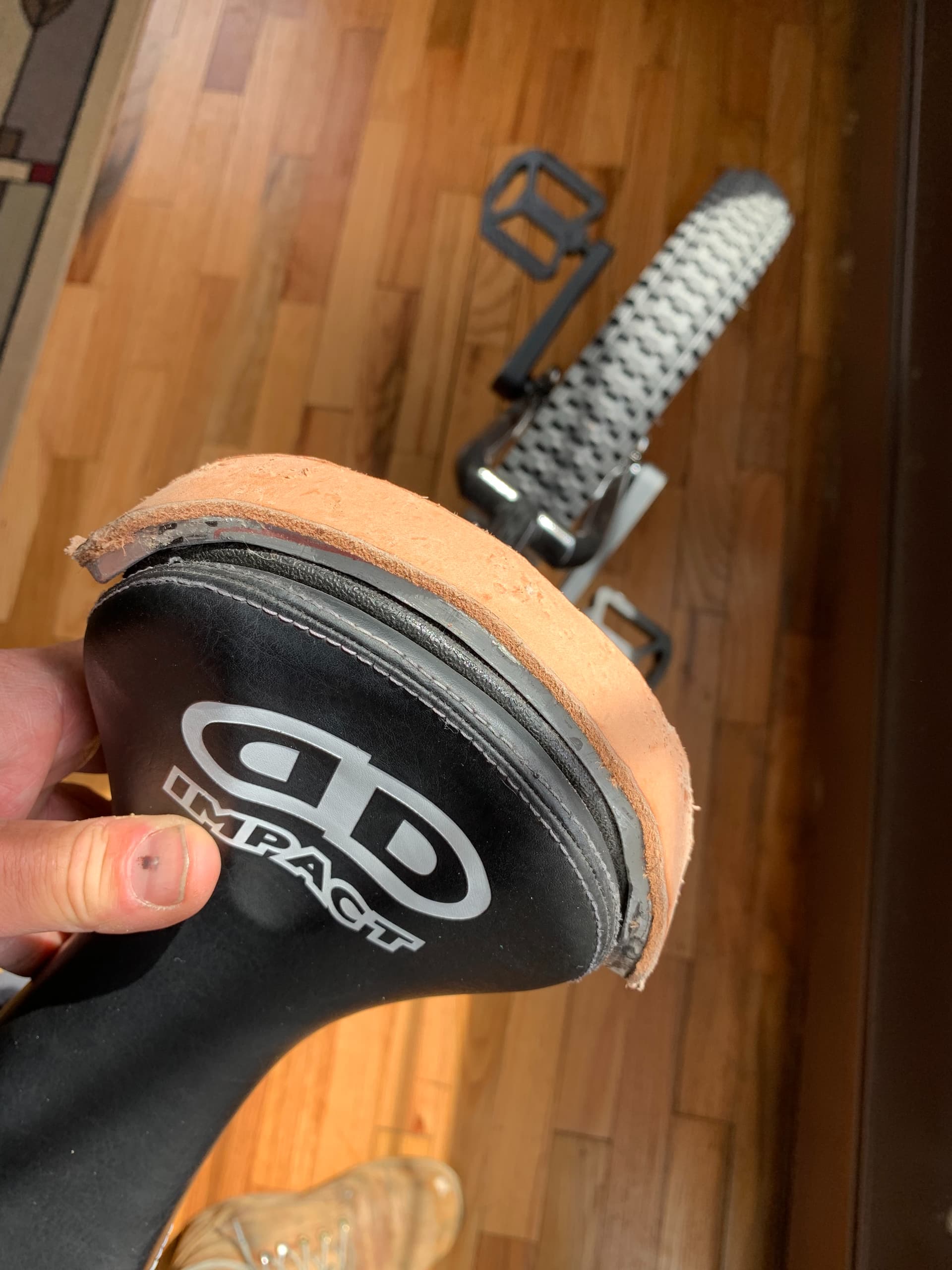 Then the aluminum bumper was scraping the tennis court, so I glued on some leather.
