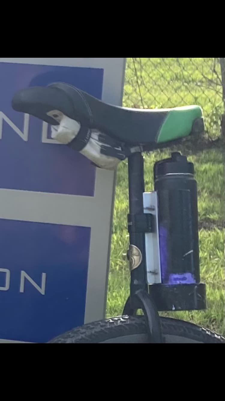 This is my solution, 3” diameter PVC pipe cut in half with an end cap glued on. That is the exact size for a bottle to click into, I use an insulated metal one but the plastic ones also work if I remember correctly, anyways that’s not the important part, just find the right size PVC, cut it in half and cap the end. The important part here is how that is attached to the frame. This is something like the 7th variation but it’s held up over the winter and many ice UPDs which are the hardest and coldest, so the most extreme environment for testing I have. The PVC to frame mount is aluminum angle stock, 3/4” I think, and I drilled and bolted that to the PVC on one side and to the seat post clamp on the other. I used washers when attaching the top bolt of the seat post clamp so it would grab the angle aluminum slightly after the seat post and then the bottom bolt grabs the seat post, so it is more like a 1.5 bolt for the seat post now but still holds it quite solidly. A fair bit of fiddling around with a file and angling the drill to get things to line up was involved but once it is all good it’s gonna last forever, or at least I hope.
