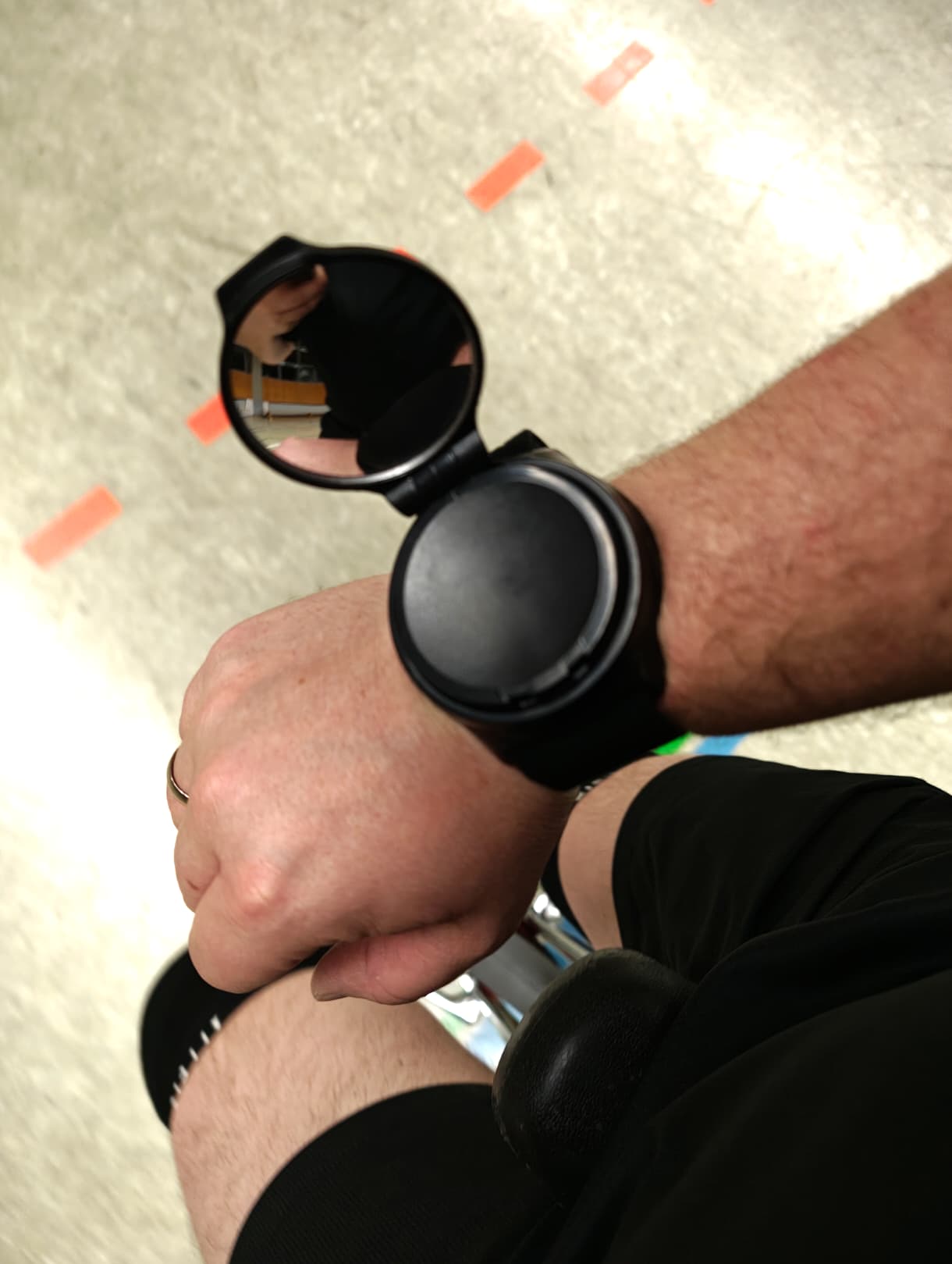 I’m looking for a possibility to check more often what’s going on behind me and thought about adding a small mirror to my wrist guard.