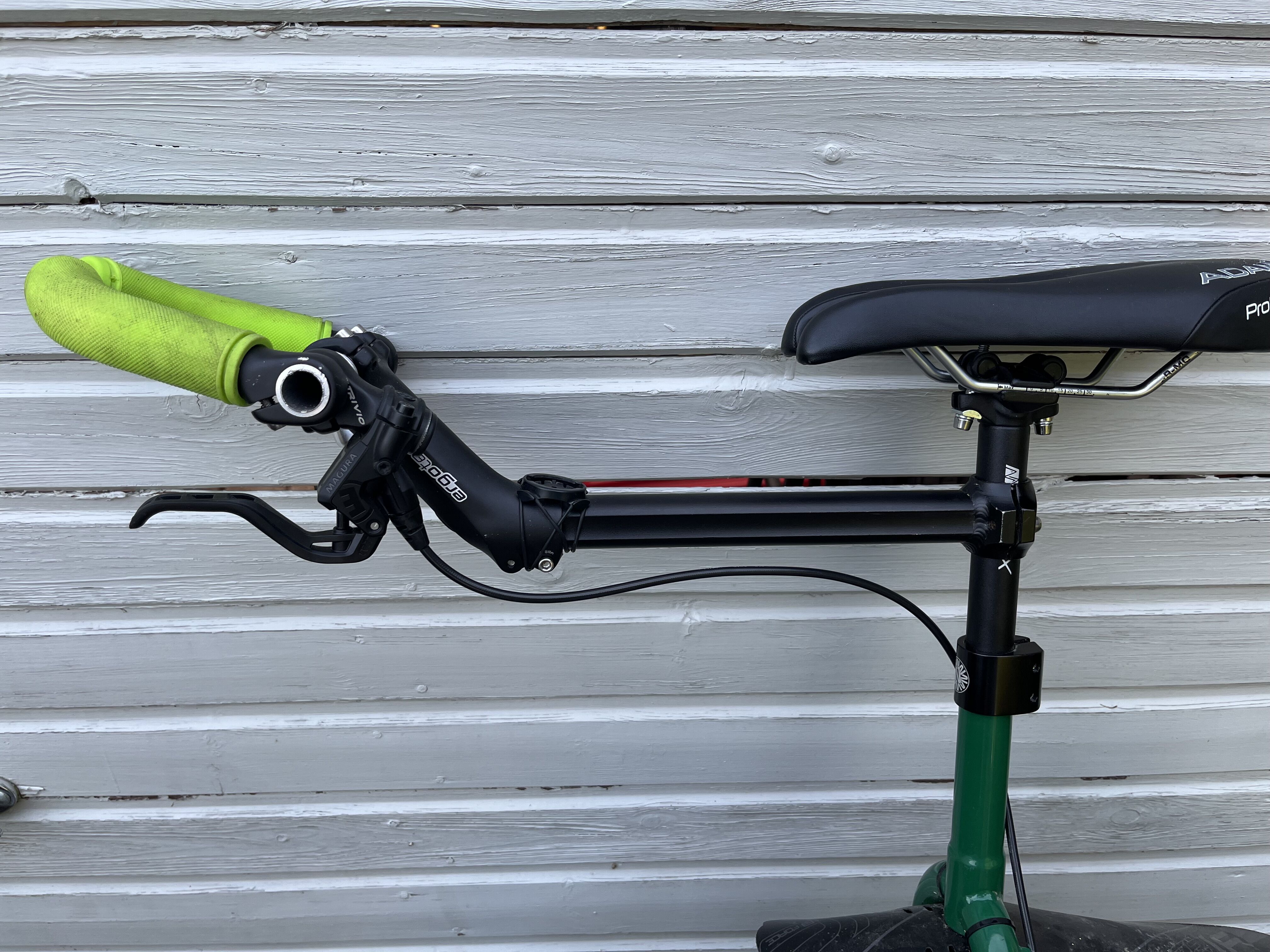 As seen below it mounts a regular bike stem (as it clamps 28,6mm) and then on the handlebar I use a 25,4mm to 22,2mm shim.