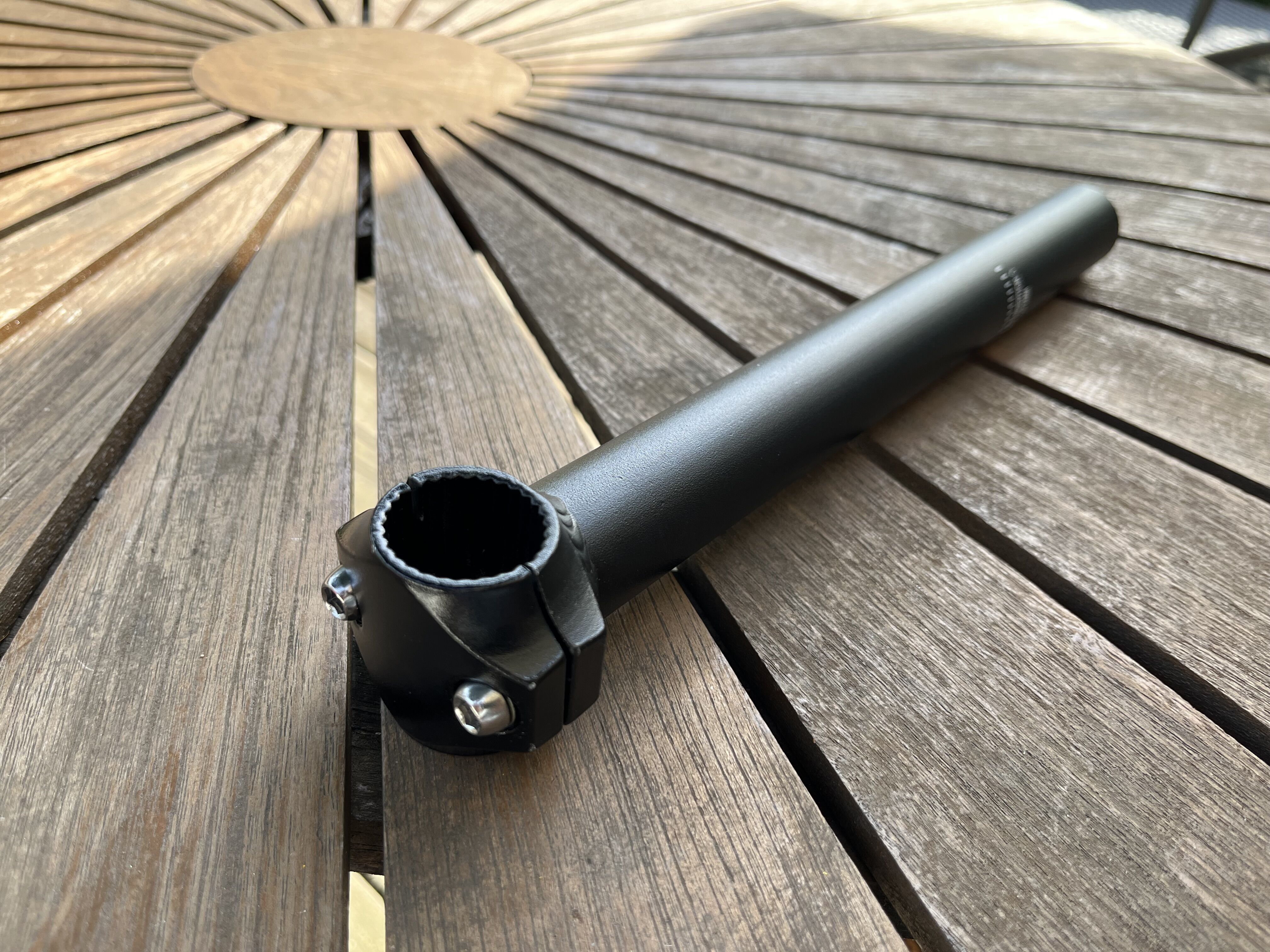 This “adapter” which can be sourced on aliexpress (search for “folding bike stem”) clamps a 25,4mm seatpost and has a 28,6mm (1 1/8") tube attached. And as can be seen on the pictures its not round but has an indent on one side.