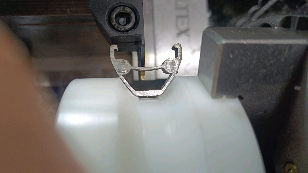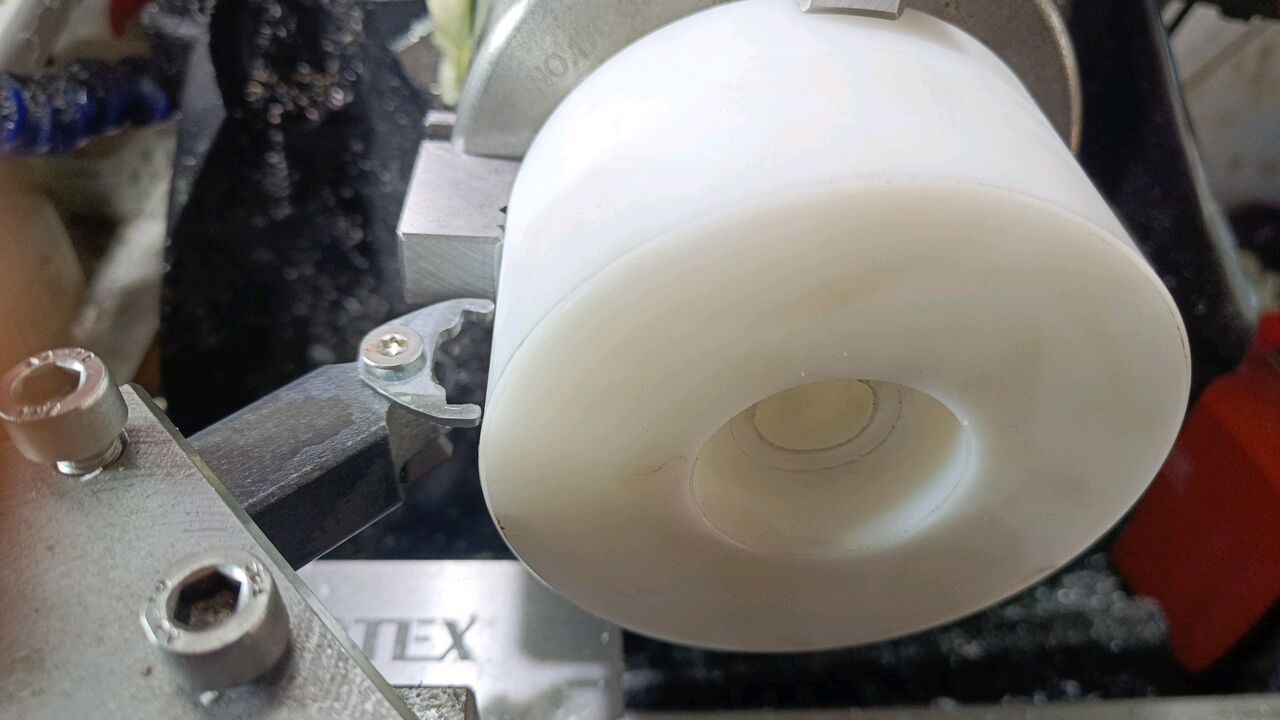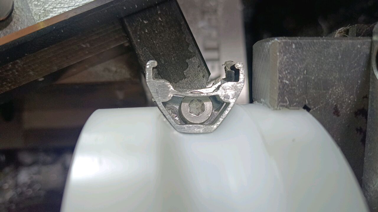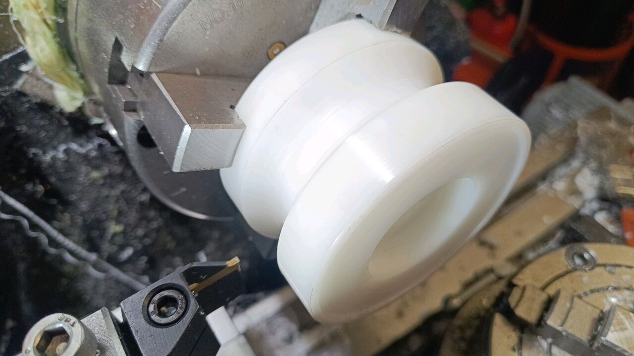 I used the bench grinder and a jig saw to fit a metal plate to the exact dimensions of the rim’s cross section and used this metal plate to groove the pom rollers. (The scratches on the plate were created after everything was finished):
