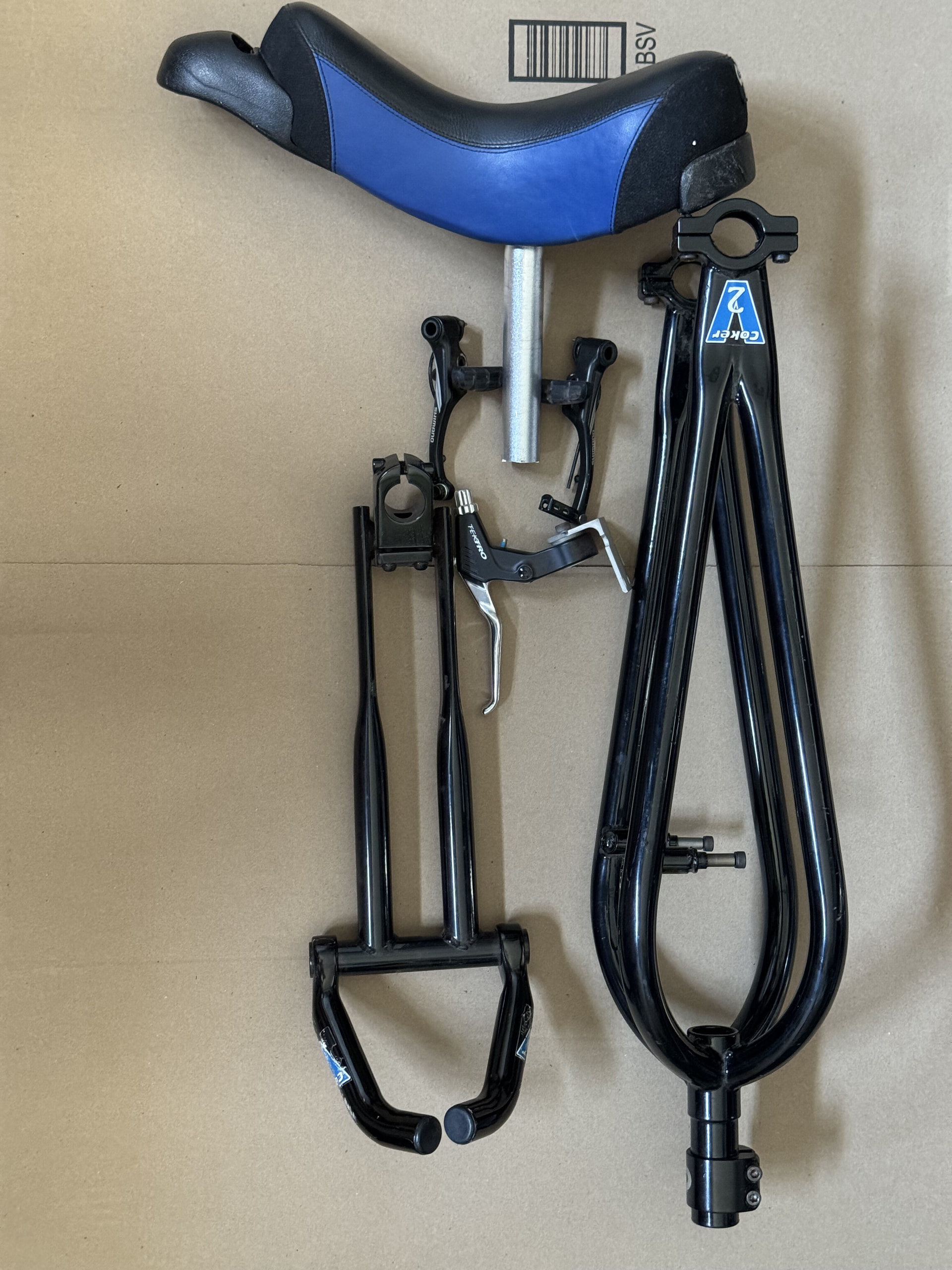 This set of Coker parts are used but still in very good condition. 4-legged steel frame should be much stiffer than the 2-legged counterpart. Add your own wheel/crank/pedal and you have a whole Coker. $100 plus shipping. Trade for a 29” aluminum frame in good condition