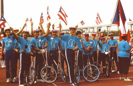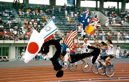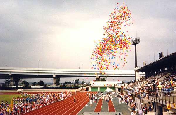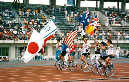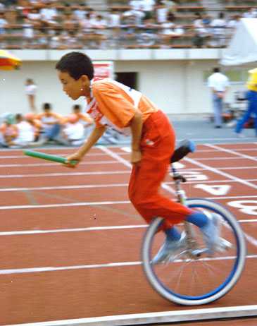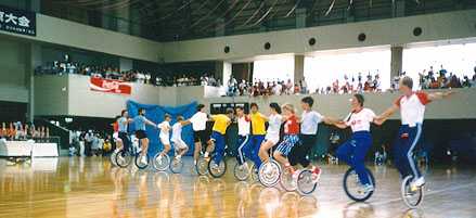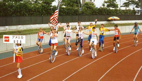 But wait, there’s more. In Japan, people don’t do unusual things very much. To make unicycling palateable to the average Japanese person, it was necessary for the sport to be brought on in large numbers. After a quaint start in 1978, the Japan Unicycling Club grew up into the Japan Unicycling Association, and started having large track-oriented meets in various Japanese cities. These meets regularly drew several hundred riders. The regional ones, that is. When we came for UNICON III in the summer of 1987, our convention was combined with the 10th All Japan Unicycle Meet in Edogawa, Tokyo. Take a look at the opening ceremony. All those people on the left are the riders, after parading around the track and lining up!