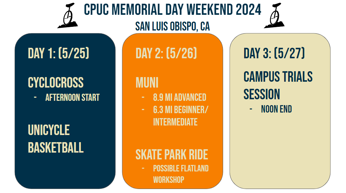 My club is interested in hosting a 3-day unicycling event on Memorial Day weekend (May 25-27 2024) to expose our riders to the larger community. We are possibly the largest collegiate club in the US with 25+ regular members, and we have a variety of events planned that most riders can engage with (Cyclocross, Basketball, Muni, Street, Trials). Check out the preliminary schedule below. We have not yet decided whether the event will be USA affiliated, but I wanted to get an idea of how many people are interested (comment below if you are thinking of attending). Please pass on the word so we can gather as many riders as possible, hope to see you there!