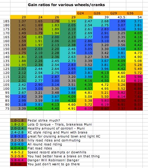 Saskatchewanian came up with this beautiful chart of all the different conceivable configurations of available crank lengths and wheel sizes and their resulting gear ratios. He even included the effective wheel diameters of geared 24", 26", 29" and 36" wheels. (Eric, I can’t help but mention that now you need to include the 32" wheel. Geared and ungeared, of course. :D)