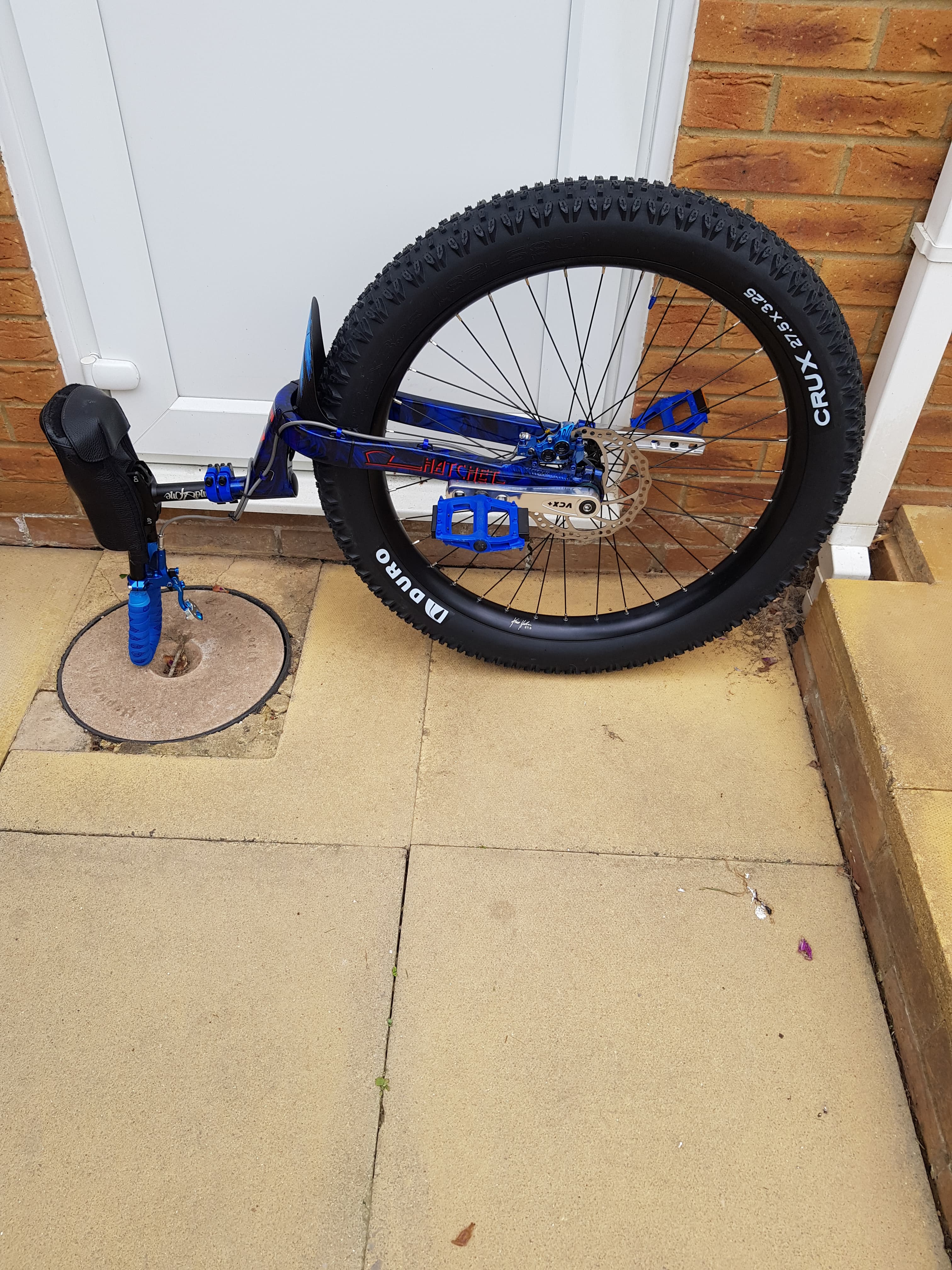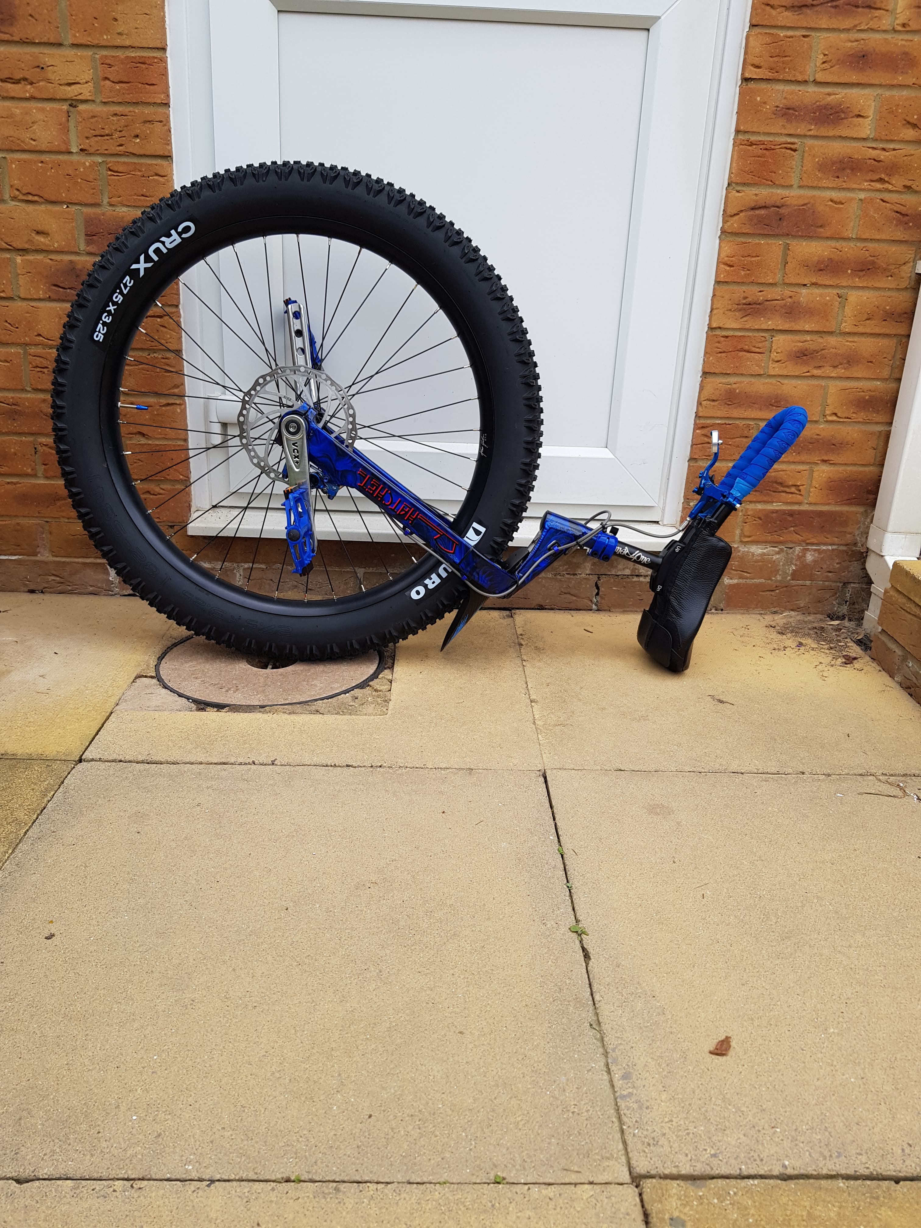 @Uni_Jack The seat or handle hit the floor first, the Handle Saddle is pretty much the same size as a std unicycle seat, its only the seat part thats half the size. This is about the strongest handle Saddle on the market as seat and handle are one piece. So the frame never hits the ground. See piccys below. It the seat bumper, handle or pedals that take damage. So no more exposed to damage than any une ![]()