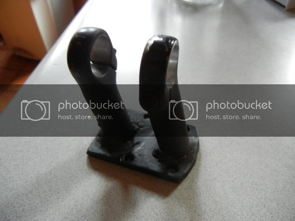 Instead of a single post like Nurse Benās, I went with two for greater stiffness in all directions. Instead of Brycerās seat clamp on a tube, I used the bar-end clamps themselves. I drilled two holes in the base plate (Aluminum, so I could use spade bit drills made for wood. A 7/8" drill was just the right size for the free bar ends I found.) Then, I could weld the bar ends from both sides. I use the term āweldā loosely, as I am just learning, and my welds show it!