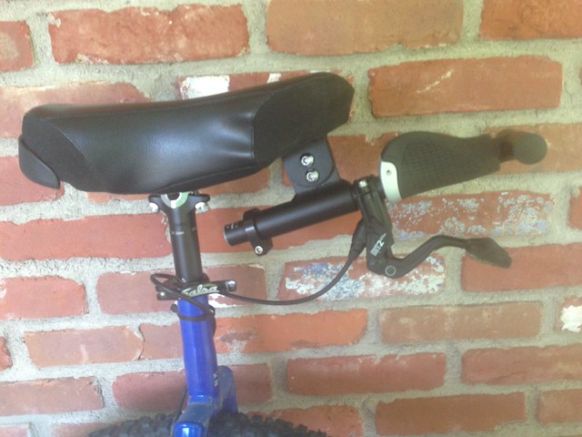 I sourced cheap $5 straight 12" piece of chrome post from my LBS to replace the T-Bar. I put the other of the pair of field hockey stick end bulbs (the first having been used on my NB handle) on there and I really like it a lot now that it is paired with a NB ghetto flat saddle though I was beginning to get along with the brake lever under the saddle with the built in handle. I found myself doing a lot more hands free riding which can also be great fun.