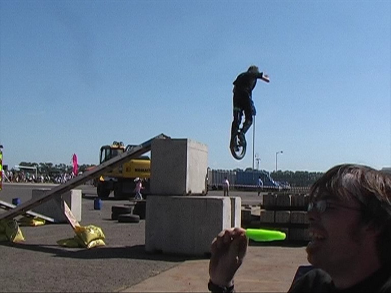 Joe hops off the highest obstacle on the course, Tom is far too busy with a healthily neon looking ice lolly.