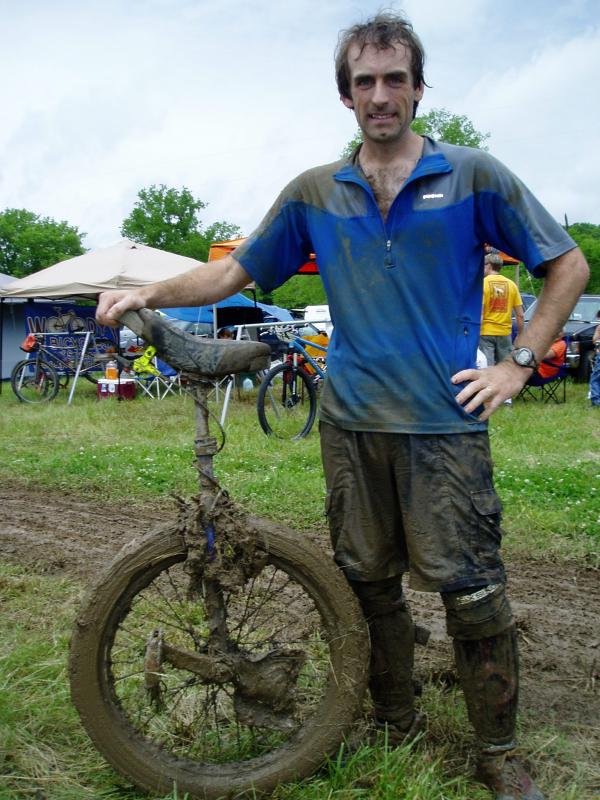 So what happened? As we all feared, the heavy rains we’ve had in this area (over 30 inches over the past two weeks) made a complete mess of the trail system the race course covers. And unlike nice, slippery mud, that is still rideable albeit very carefully; we had the peanut-butter <-> cemet consistency type “clay” soil to contend with for the majority of the 12 hour event! Ironically I did a little pre-riding of the course the afternoon before (Friday) and probably rode more in that warmup that I did during the race! So I ended up placing fairly well simply because it was far easier to carry/push a unicycle around the course than it was to do the same with a bicycle. It was pure chaos. We all started out right as it started to rain. If the rain had held out, the course was dry enough to have been tricky but still rideable that day. But luck wasn’t on our side and within a few miles most everybody but the fast starting pros were left alternatively pushing their bikes or else stopped on the side of the trail trying to clear out enough mud with a stick to let the tires roll for another 100 yards! It was very bad! The mud was so binding that you couldn’t push any type of wheel through the muck! At one point I just held my unicycle by the seat handle and just dragged the whole stupid thing through the mud as my wheel wouldn’t even turn! Finally I sobered up the situation and realized my riding was over so I stopped and cleaned as much mud off the tire as I could and then just shouldered the beast and began to hike for the next 7 hours or so!! For mot everybody else, at the earliest opportunity, around 4-5 miles, a large part of the racers abandoned the course and cut back to the start finish area. Of those who toughed it out one loop, most didn’t even start, let alone complete a second loop (this includes relays!). It was quite possibly the worst case scenario. I think the only reason this event was even held was because it is on private property and the owner is a mountain biker himself who built all the trails and this is the only event (or only time to even get to ride these trails) all year. The lack of riding didn’t seem to dampen most people’s spirits as most folks were well along in their imbibing by the time I finished my first loop; and totally tossed by the time I came around again. Thank heavens the race director, after seeing what lap times people were churning out, decided to not allow anybody back OUT THERE with just 3 hours left in the event. I technically could have started a third, but the fact that my second loop took roughly 4 1/2 hours there was no way I’d finish in time as all loops had to be completed UNDER the 12 hour cutoff. No worries I really didn’t want to go back OUT THERE!
