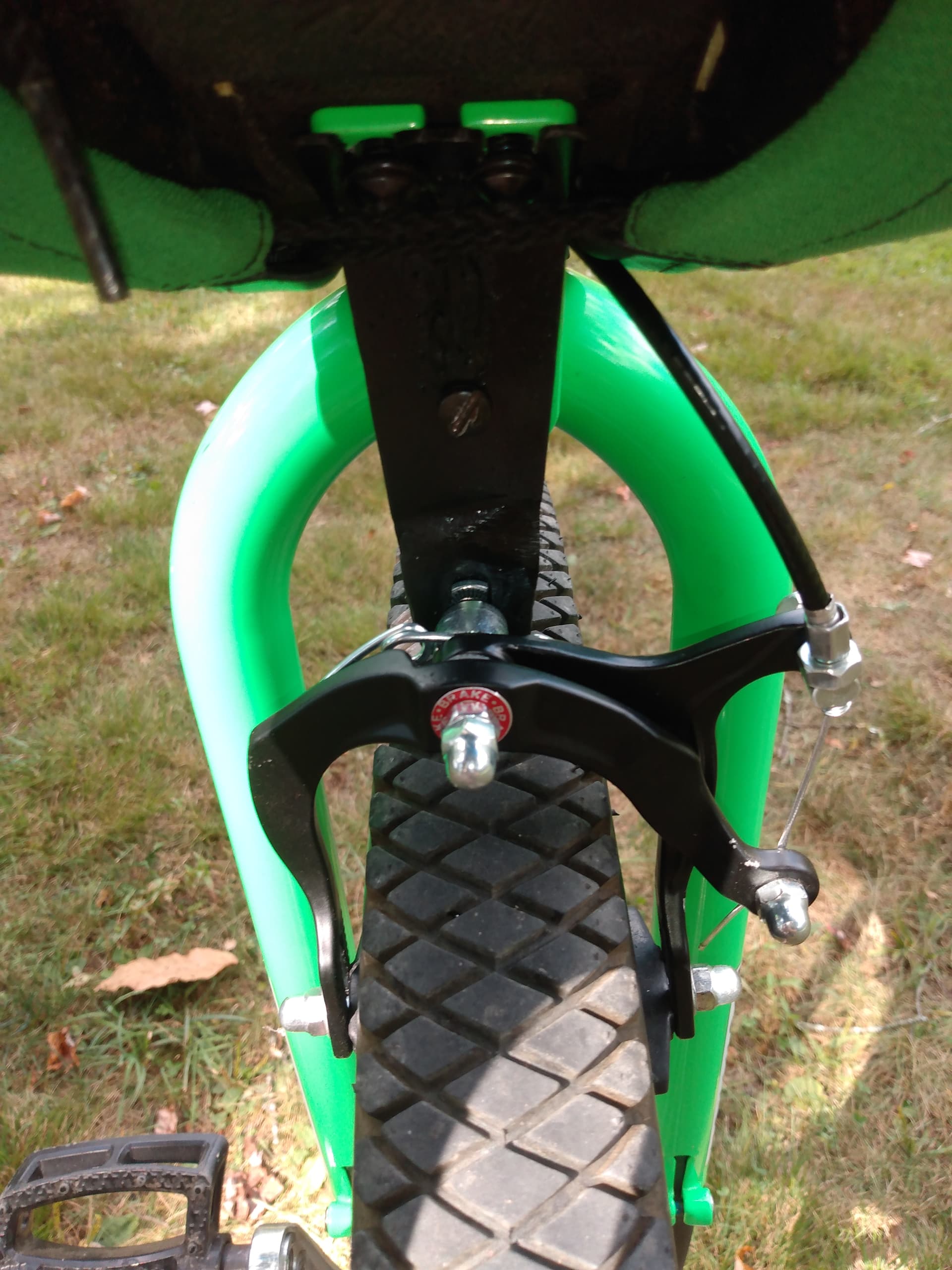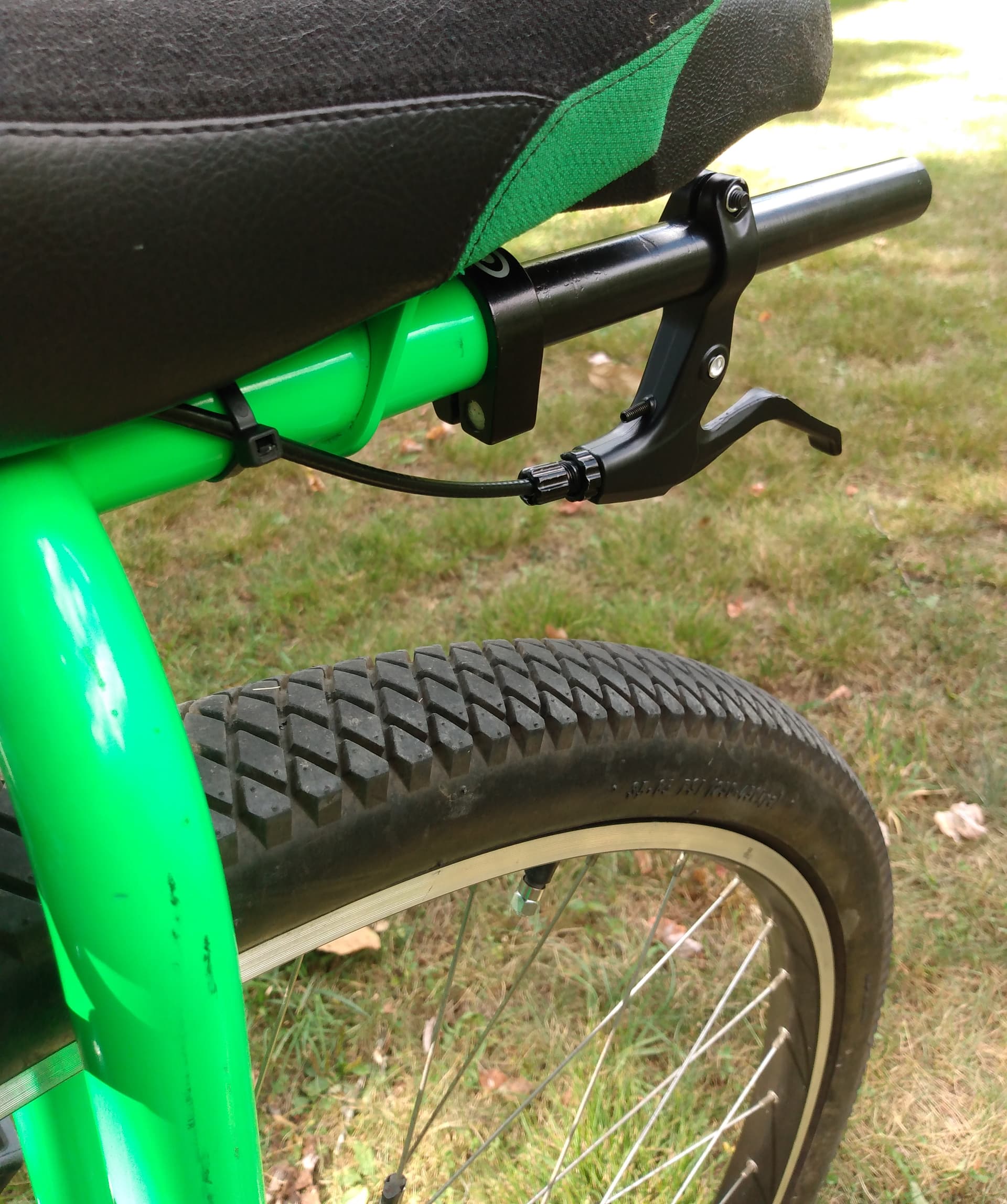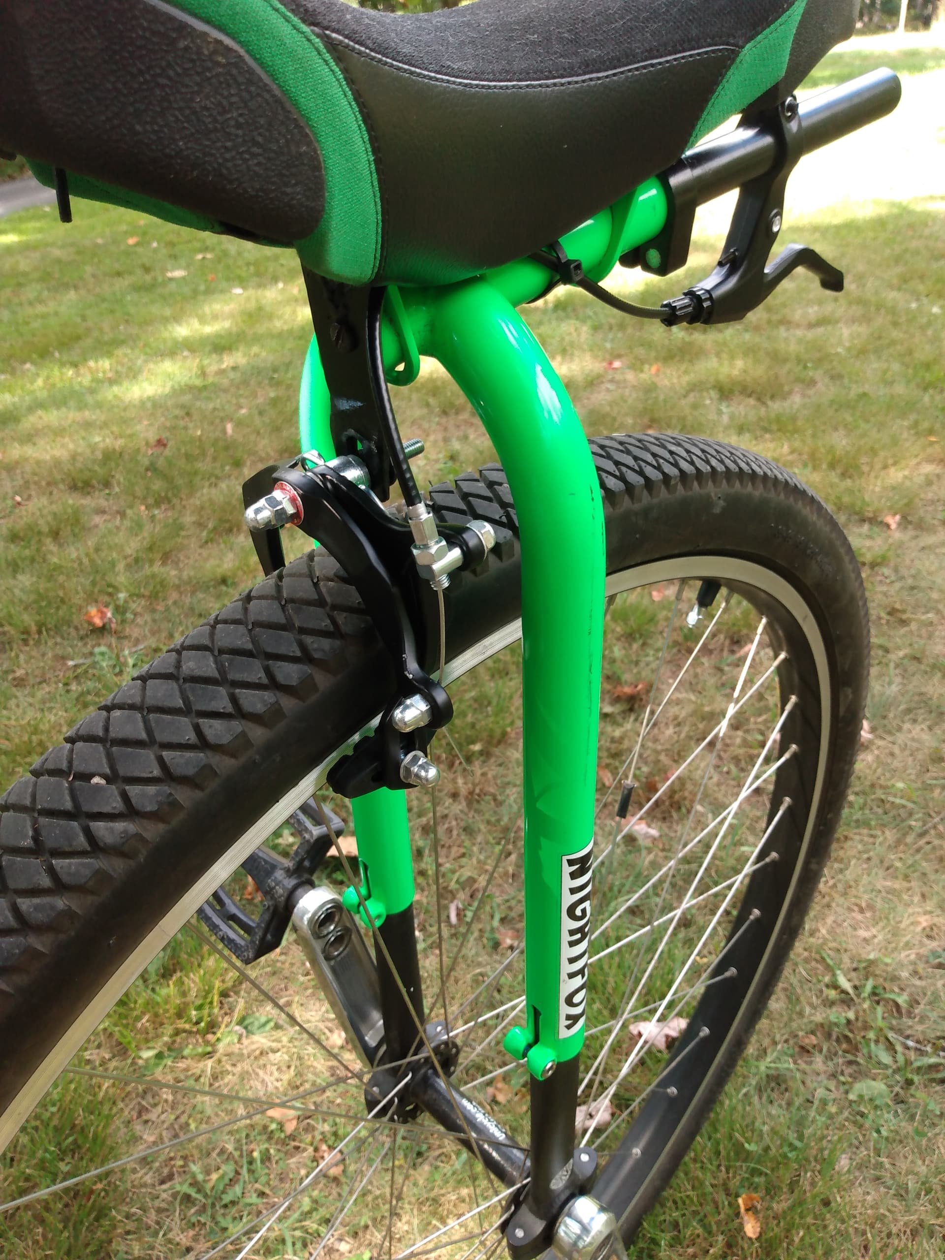I bought a used Nimbus Nightfox a little while ago, and when I bought it, I figured I wouldn’t need brakes because I’ve got functional legs. However, I live in a place where there is no flat roads or paths whatsoever, just hills. From my first ride on the Nightfox, I realized that I’d made a big mistake buying one without brakes. I needed brakes of some sort if I wanted to actually ride anywhere. This was a problem because the uni had none of the mounts and components for disc brakes. So I got myself some cheap caliper brakes. Because the Nightfox’s frame extends rather than the seat, I had to figure out some way to lower the brakes so they’d reach the wheels. My brother invented and welded a piece that bolted to the bottom of the seat and the hole in the frame that was already there. He shortened the cable and adjusted the brakes. The short handlebar came from an old b!ke handlebar (I might get a real uni handlebar eventually). To put disc brakes on the Nightfox would have cost me over $500. This only cost me around $50.