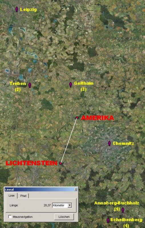 ich habe schon seit längerem die Idee, mal eine Einradtour von Lichtenstein nach Amerika zu fahren. Die Strecke sind ca. 20km Luftlinie - ich würde mir ca. 30-35km Fahrstrecke rechnen. In der Umgebung der Strecke kommen einige Einradfahrer zusammen. In Leipzig und Chemnitz habe ich die Anzahl der Einradfahrer mal nicht eingetragen, da kommen jedenfalls einige zusammen - bei den kleinere Orten habe ich die Anzahl mal der Seite 1radfahrer.de entnommen.