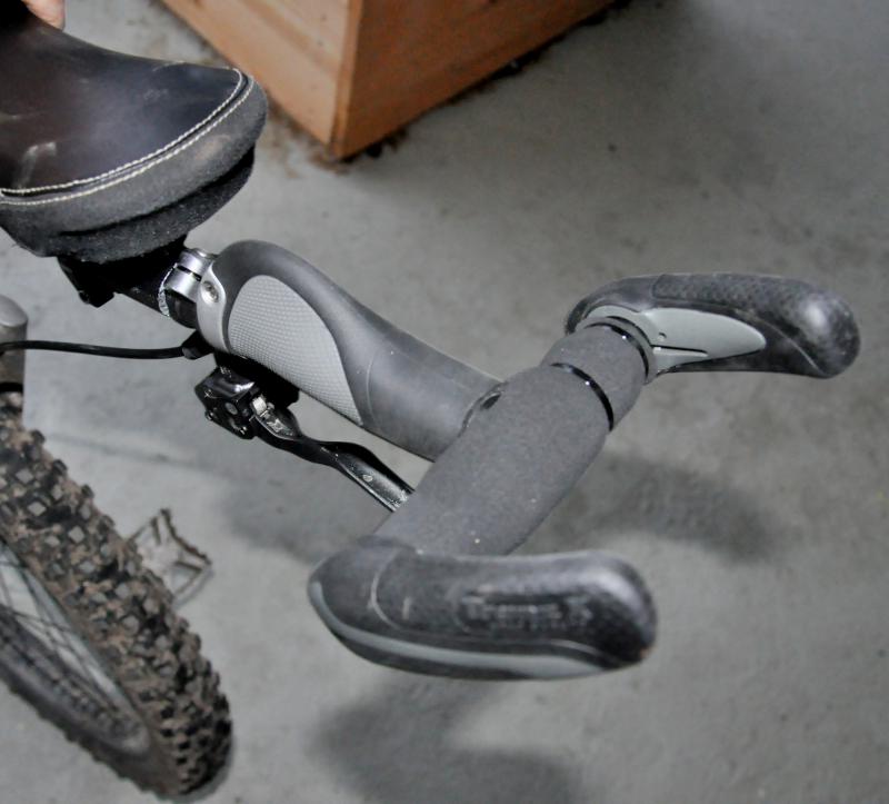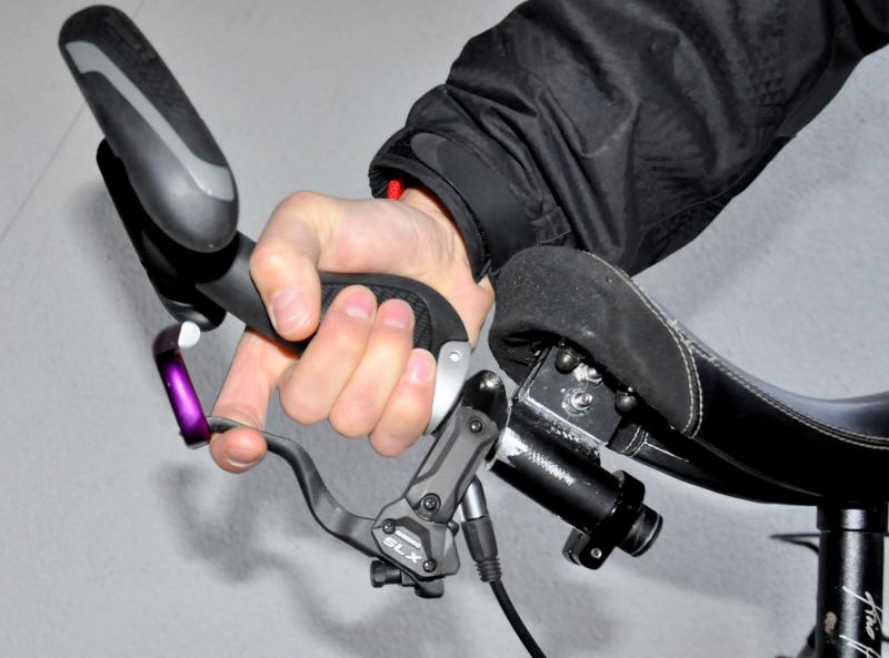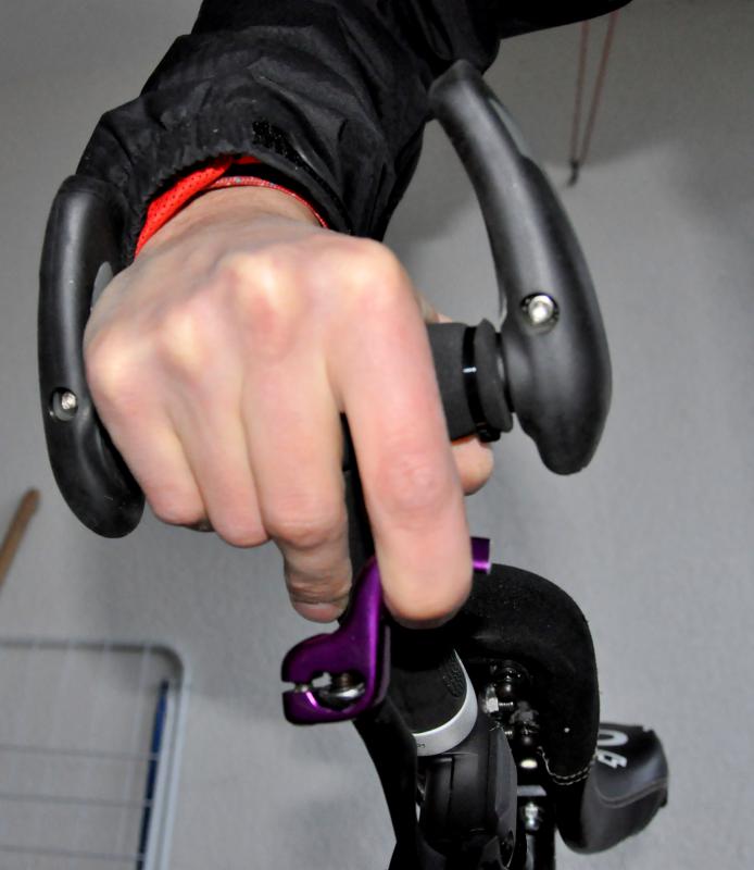 Ich hab von meiner Variante noch ein paar Detailfotos gemacht, um zu zeigen wie das denn in Aktion aussieht. Ich bremse also mit Mittel- und Ringfinger, während Zeigefinger und kleiner Finger mit dem Daumen das Querrohr fest umschließen. Ich finde es geht ziemlich gut, ausser wenn wie Gestern die Bremsen vor lauter Matsch und Nässe ihre Wirkung verlieren.