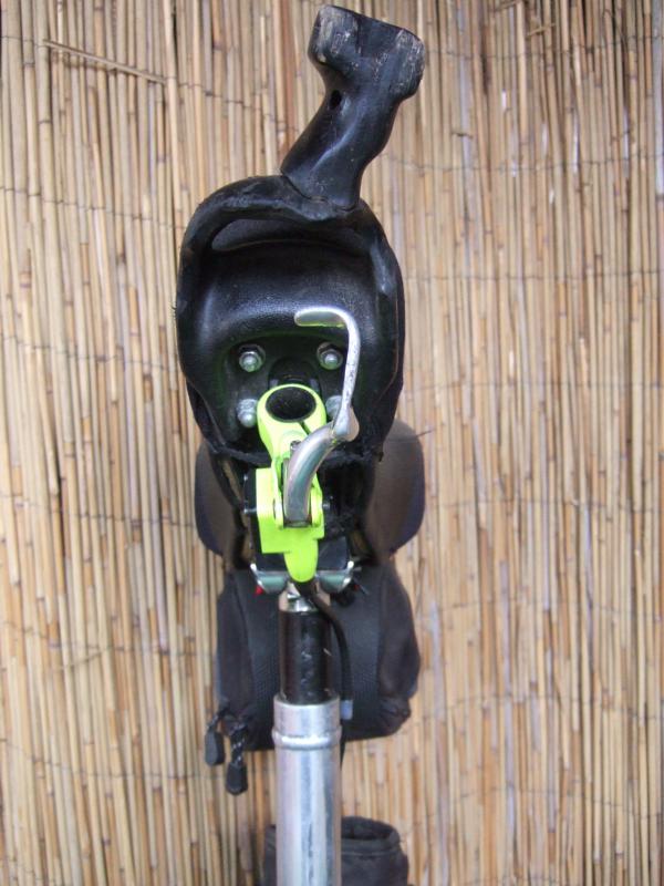 Doch man kann die Bremse extrem fest und sehr kontrolliert ziehen und auch wenn man nicht bremst, hat man einen sehr guten Halt am Griff. Man könnte den Bremsgriff auch noch etwas weiter nach vorn versetzen. Ein anderer großer Vorteil ist, dass man den T-Bar einfach herausziehen kann, indem man nur eine Schraube löst. Dann kann das Teil einfach im Rucksack verschwinden und die Bremse bleibt wo sie ist. Nur über das dann verbleibende Loch im Sattelgriff muss ich mir Gedanken machen (eine passenden Stopfen finden, damit man sich nicht den Finger darin verletzt)
