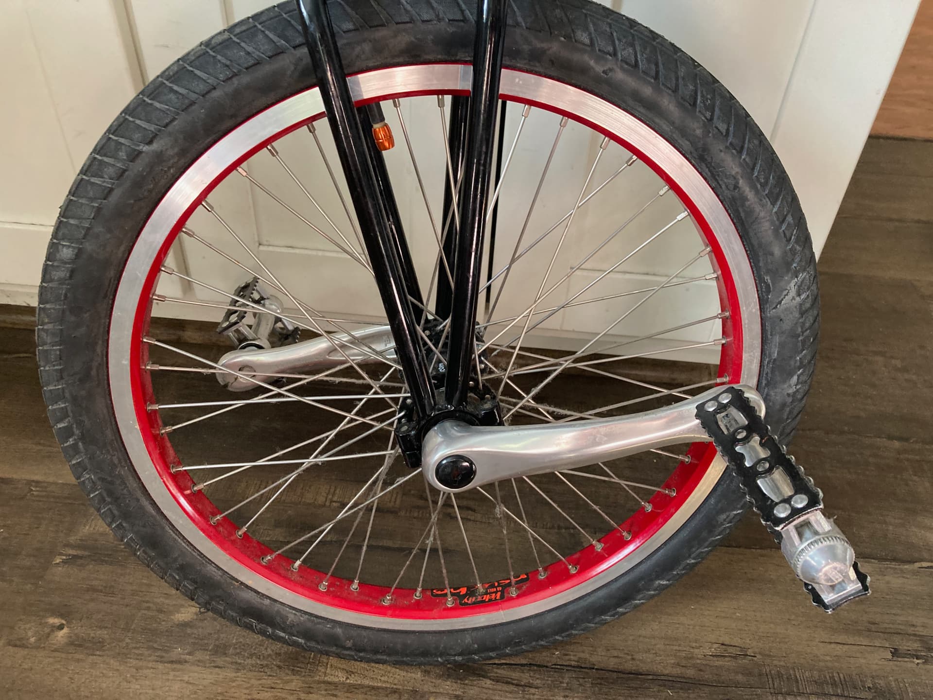Velocity Psycho 48h rim, UDC 48h square taper hub, Sugino 165mm unicycle crank arms, MKS pedals, Fly Ruben tire, Kris Holm unicycle seat post, Nimbus seat. The frame takes a 26.8mm seat post so there is an adapter shim 26.8mm >> 25.4mm for the 25.4mm seatpost. Set up for me as a 5’11" person.