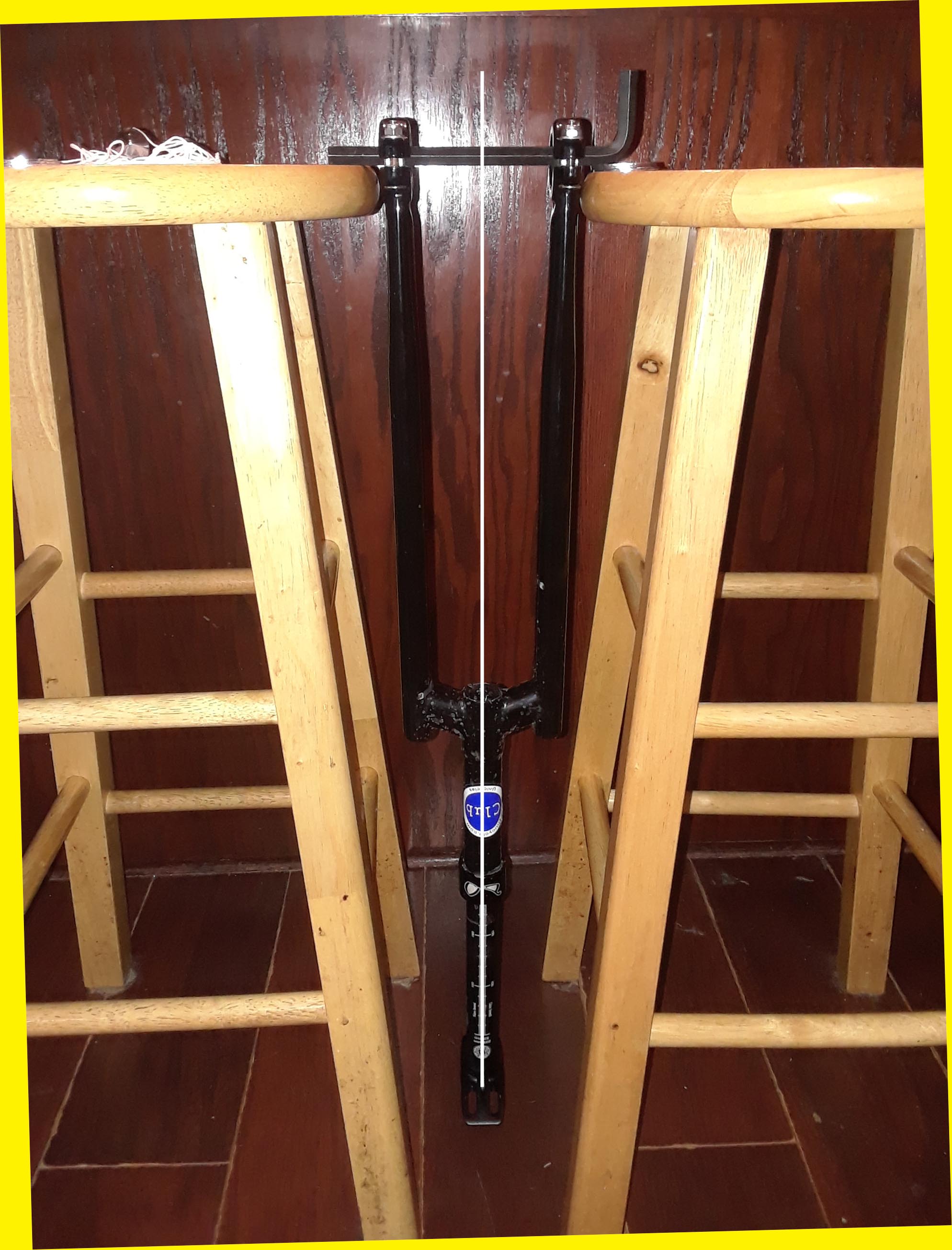 It might be just in my mind, but it looks bent in your photo – it looks that the seat tube is bent towards the left hand stool. That was my impression before I read that you had measured it to be bent so it wasn’t influenced by that. It looks like you have a spacer on the right hand stool, is that to level the Allen key or to try to correct the plumbness of the hanging frame?