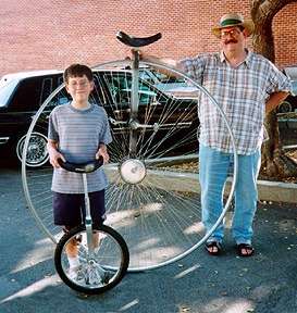 The big question here is: Why the big wheel if you have gearing? He could have done the same thing on a Coker and had a much more comfortable ride. ![]()