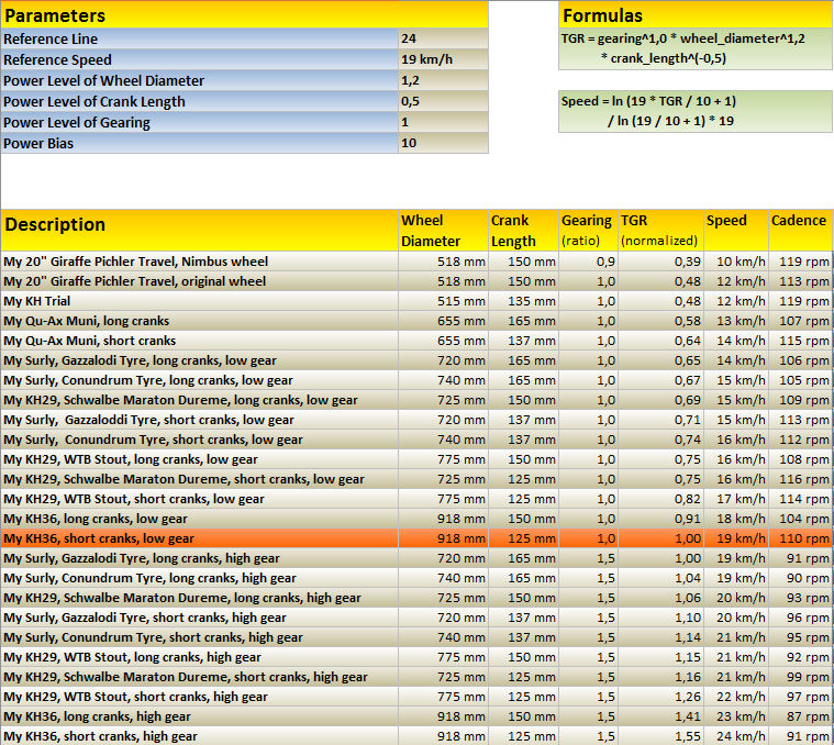 Fürs KH20, KH36 und 26" Muni stimmen die Werte verdächtig gut. Mit dem 24" Muni war ich zu schnell. Und das obwohl ich mich auf dem 24er relativ unwohl fühlte (der Reifen war nicht wirklich straßentauglich, die Kurbeln waren zu lang dafür, daß es sehr flach war, bei dem kleinen Rad ohne Schlumpf fehlte das Gefühl des Vorankommens, ...)