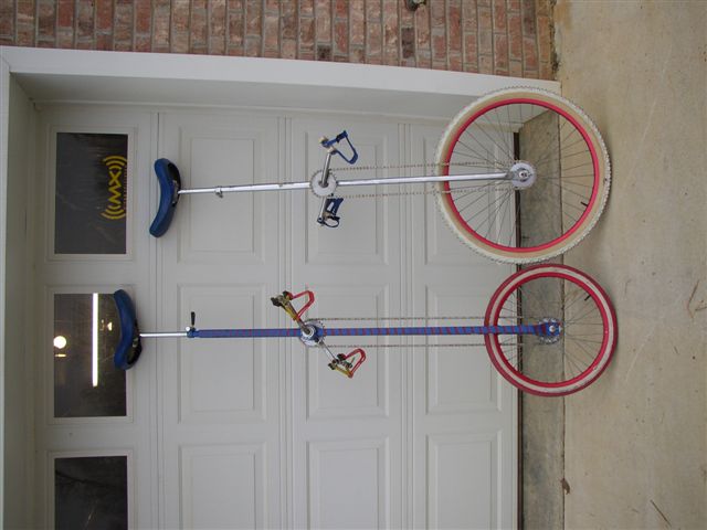 As per Harper’s request in the 2nd reply, here is a picture of my Giraffes. The Schwinn Giraffe was retro-fitted with a 26" wheel (& a snazzy white mountain bike tire circa 1989 or so). The other giraffe was built by Tom Miller of Unicycle Factory fame. I did the red & blue striped paint job.