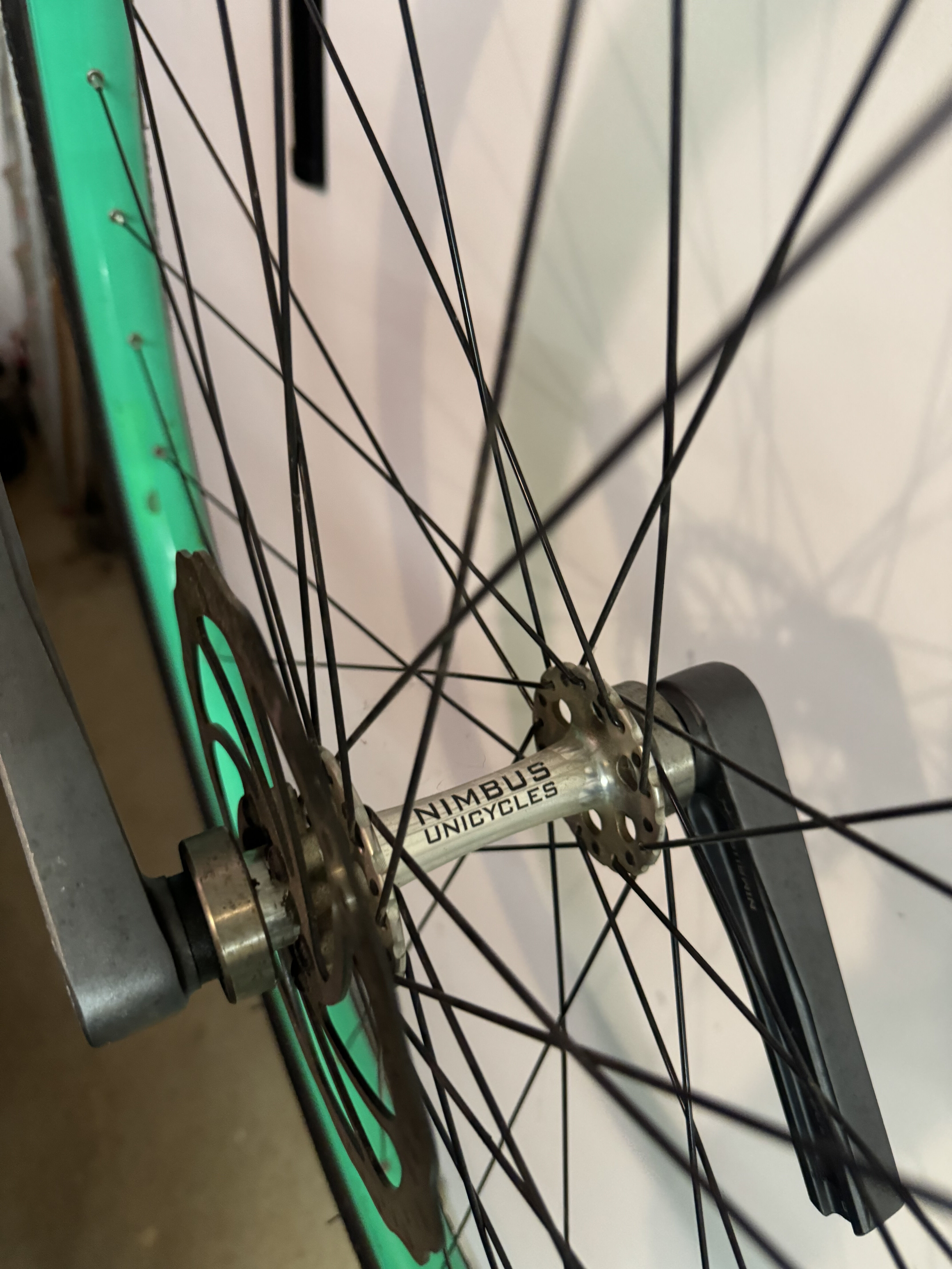 I’ve got a 36" complete wheel from a Nimbus Oracle that I’m looking to unload from the garage. I have ridden it quite a lot and have replaced the tire once. I have bought a few carbon rims and no longer have the use for it. I have a pair of VCX 150mm cranks arm on it. 125mm spacing. I have a new set of bearings I can send with the wheel as well, they are fresh in the bag from UDC. 36 hole aluminum hub. Bought the wheel as a complete unicycle. Never had any issues with the wheel and this wasn’t my first 36’’ so it hasn’t seen too many falls. It has a 36’’ blue foss tube in it and I have an extra one that has been opened, but not used I can throw in as well. I haven’t ridden it in a long time, but like every foss tube I have ever had it deflates over time, but I try to keep it between 25-35 psi while it hangs on the wall. Asking $225+ship.