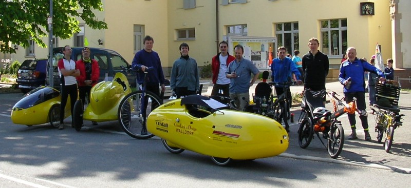 So sah unsere kleine Karavane aus. Zu beachten ist der Mensch ganz rechts. Er ist knappe 80 und ist da auf seinem selbst gebauten Liegerad völlig problemlos mitgefahren.