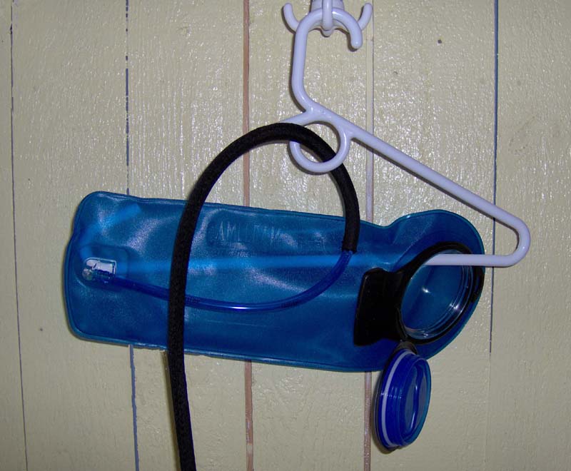I made this from a plastic coat hanger. Cut it with a saw then sanded the rough edges. It works really well. I remove the bite valve and store it in a small mesh bag while the bladder is drying. I hang the mesh bag from the hook on the hanger.