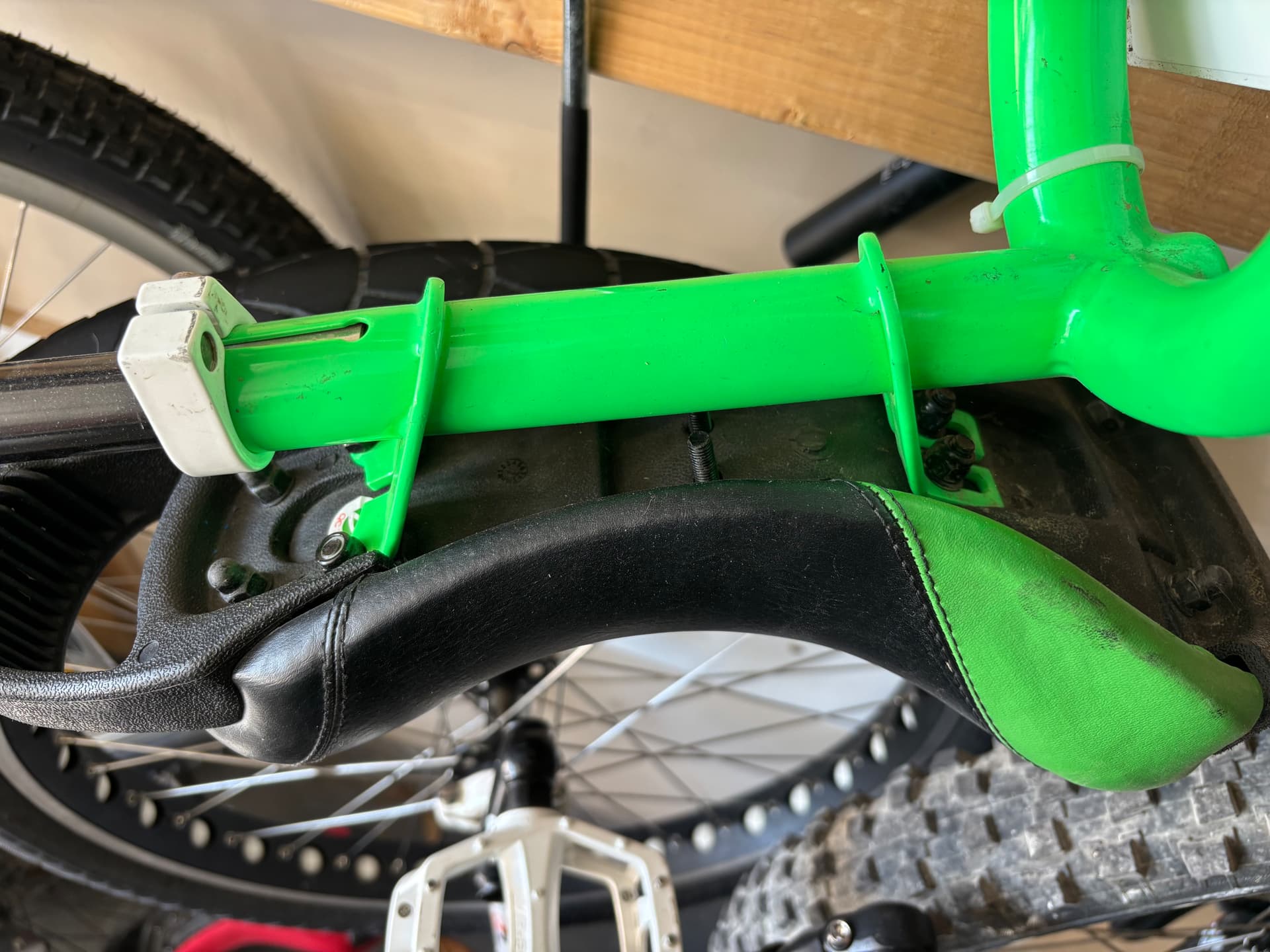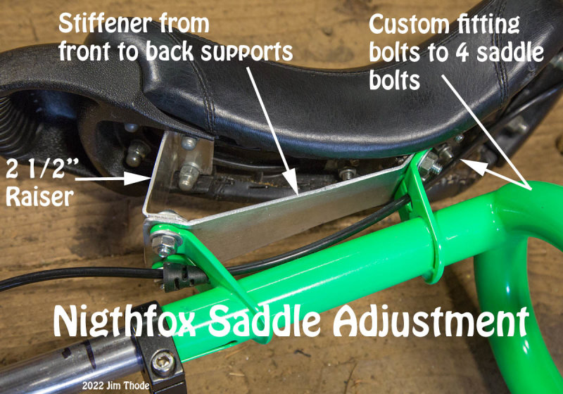 Jim T always comes up with a home spun solution, good job. I feel I’m in need of making a similar bracket, although maybe not quite as severe. I feel I could use a bump up on the front, it feels to me that mine angles down. The same saddle is not as comfortable on my night fox with 32 wheel as it was on my 32 titan. My night fox frame is the old style. I think they may of addressed seat position in the newer design.