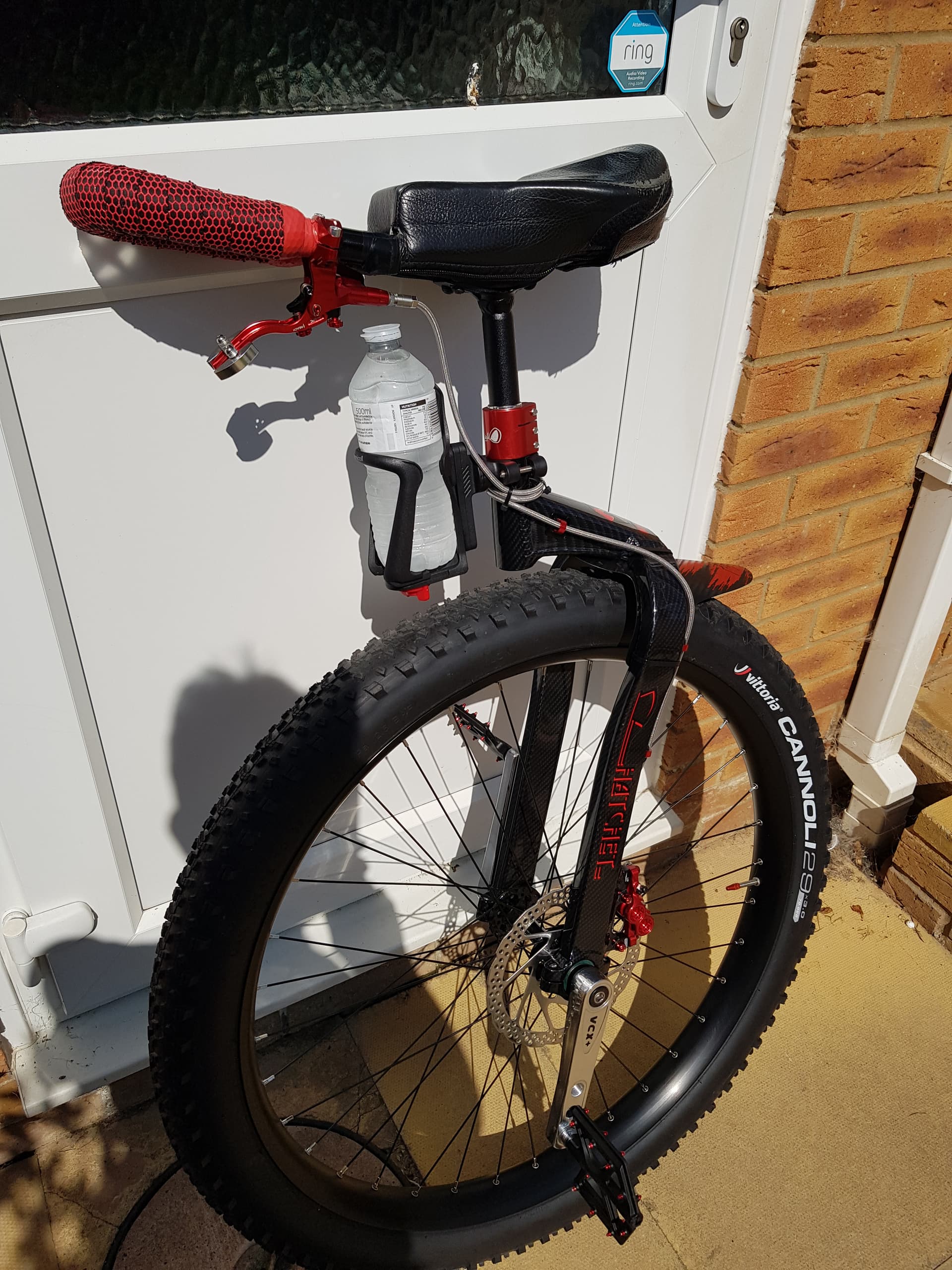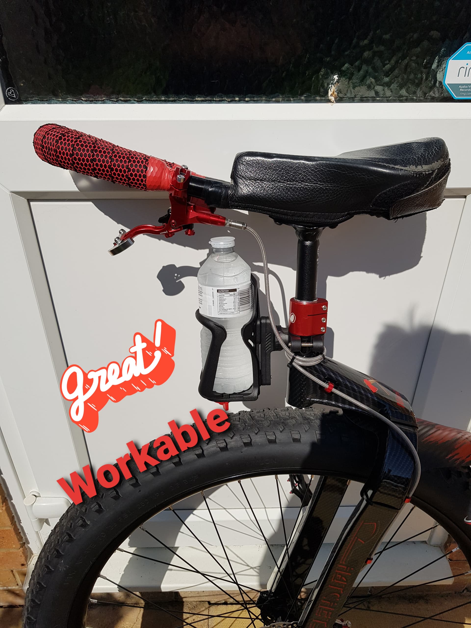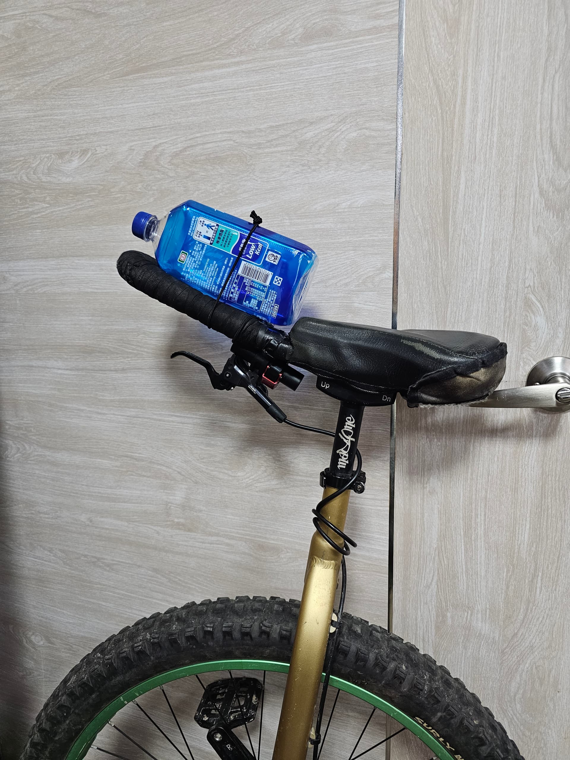 @Syoten Haha, I was thinking along these lines, just bungy on, a water bottle like you have done. Thats not a big water bottle though, it looks larger than it is, against the bars. Like you say the bars and brake are not easy like this. Cheap and easy mind, just a few bungys or cable ties and a suitable bottle ![]()