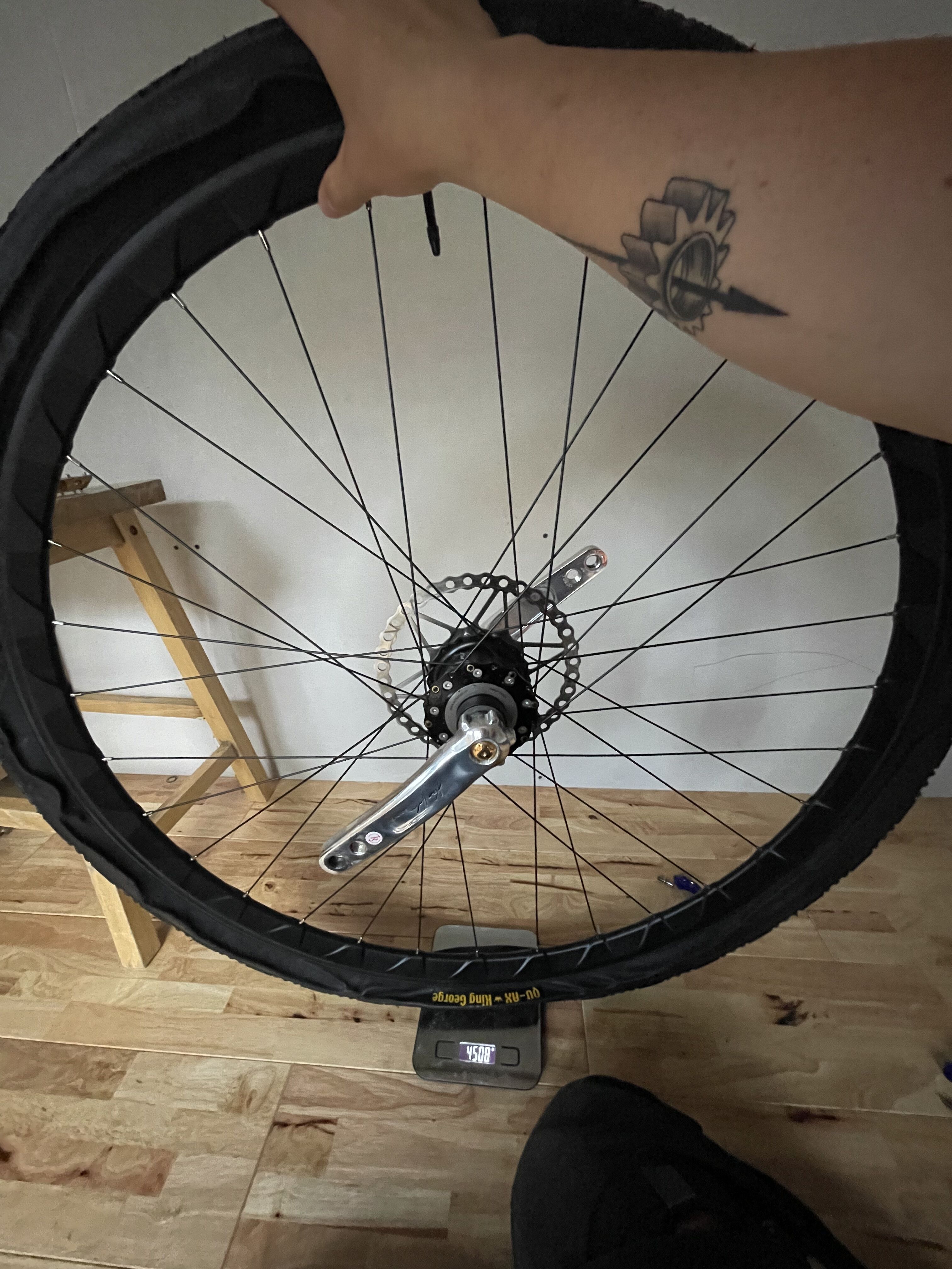 So this is 100mm 32h, Braus Rim - TPU inner tube and King George Ultimate = 4500g~