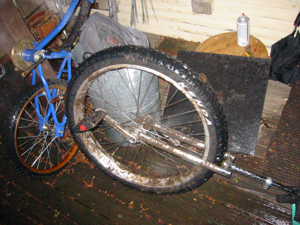 Tonight it was raining. My ankle kinda hurt, it was getting dark, and I felt it was the perfect time for another test ride. It’s been raining for a few hours. As most of dont yet know, my neighborhood is pretty hill filled. Which also makes it a mud trap. So without changing the tire pressue, and still running the Kenda 2.6, I set out in search of thick mud. Initially I found a couple downhills of mild decent that had a reletively thin layer of mud (up to an ich or so) and set to work Switchbacking down the slippery spots. Nothing. Absolutely no tire slippage was noticeable. I still felt the wheel rode great on pavement, with the only problem occuring when hitting a curb wrong (the local ones are about 5 inches) and rimming pretty easily. Next I found a large mud patch at a local park. If I estimated the size right, it’s about 100 meters across. The first 50 meters or so I barely had any problems at all. the next 30-40 meters I had a bit of trouble, but still plowed through it pretty well. Right at the end I started getting caked with mud, to a point were I started to spin out, and finally fell off. I continued to be amazed with the mud sheding, traction retaining abilities of the wheel. I figured that if I lowered the pressure even further, It would have further improved traction. But… I still had to ride home, so I didnt want to risk it.