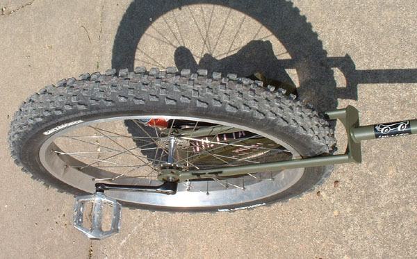 I took it out for a good ride this afternoon. The 26x3 inch Gazz is very heavy. I had more trouble starting, stopping, and making sharp turns, compared to when I was using the Panaracer MegaBlaster 2.5. I also had more trouble with downhills, but I attribute that to the shorter cranks I’m now using. On a posative note; I liked the increased momentum gained by having the extra weight of a heavy tire. With the 150mm cranks, I was able to get it going pretty fast and it was easier to maintain that speed. The Gazz rolls straight over imperfections in the trail. This trail is pretty rough since it gets used by horses a lot. The increased momentum allowed me to just bomb over small logs in the trail without slowing down. It would have been hard to slow it down fast anyway.