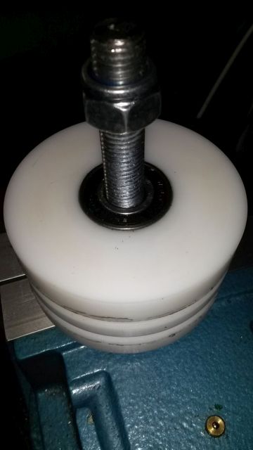 Die Kugellager setzen wir in die Mitte der POM Rohlinge. Es mag aber auch ohne Kugellager gehen, d.h. nur ein Loch durch die POM Stücke bohren. Es macht anscheinend nichts aus, wenn das Loch einiges größer ist als die M16 Gewindestange.