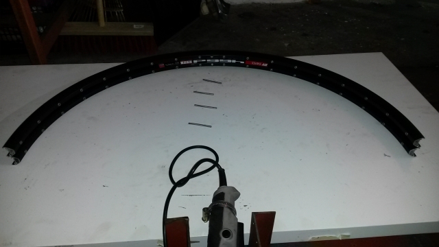 Die verbogenen Enden der fertig gebogenen Felge sägen wir ab. Jede Seite hat dann 18 Löcher plus je ein Ventilloch