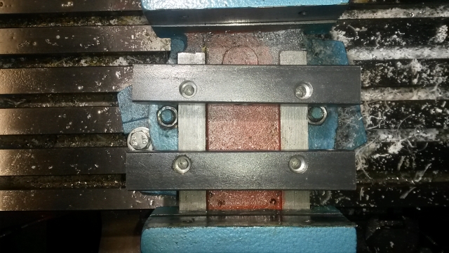 In die beiden Vierkantstähle schneiden wir 3 M16 Gewinde und bohren Befestigungslöcher, so daß man sie im Schraubstock festschrauben kann.