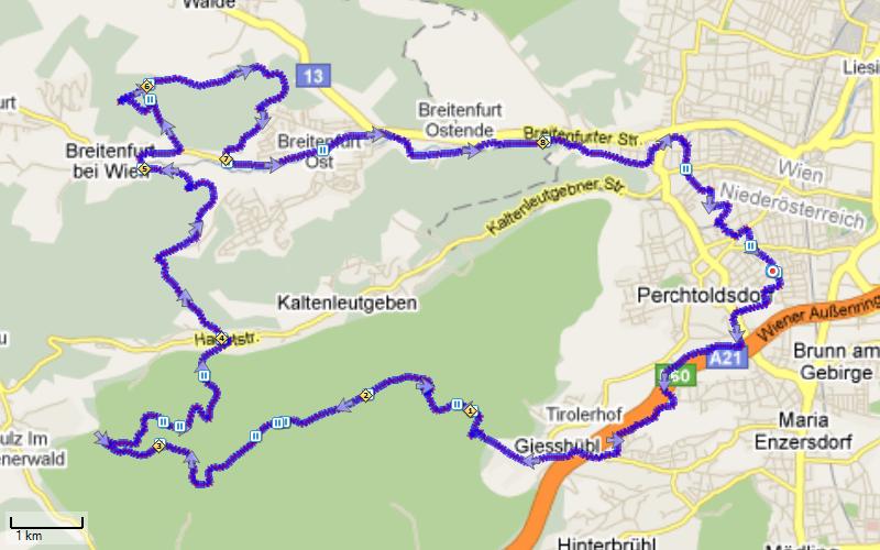 Weiter geht die Fahrt nach Breitenfurt hinunter und von dort auf dem Radweg nach Hause. Fast 40km bin ich gefahren. Über 600 Höhenmeter bin ich hinaufgefahren und das bei einer Durchschnittsgeschwindigkeit von 13,5km/h.
