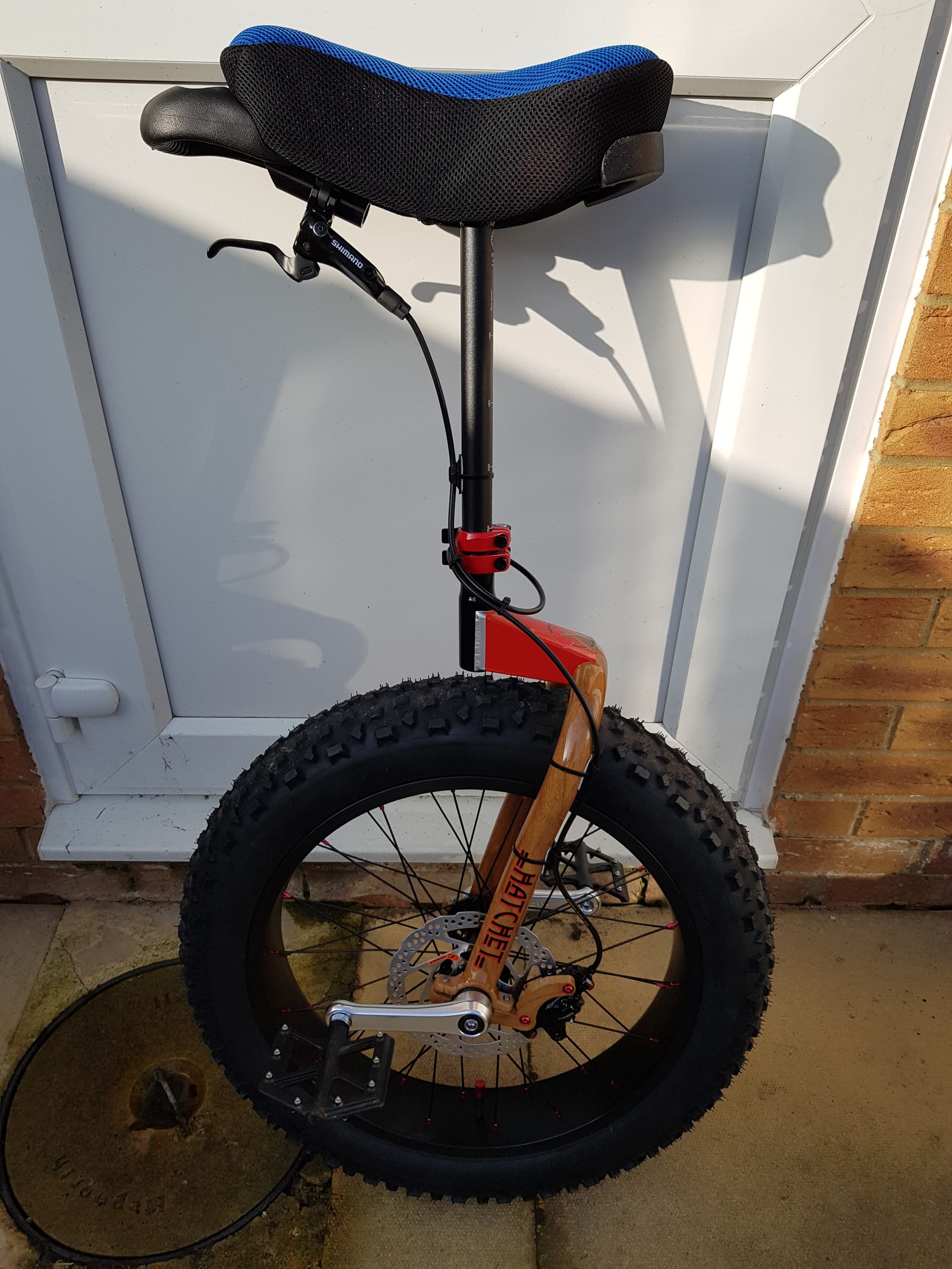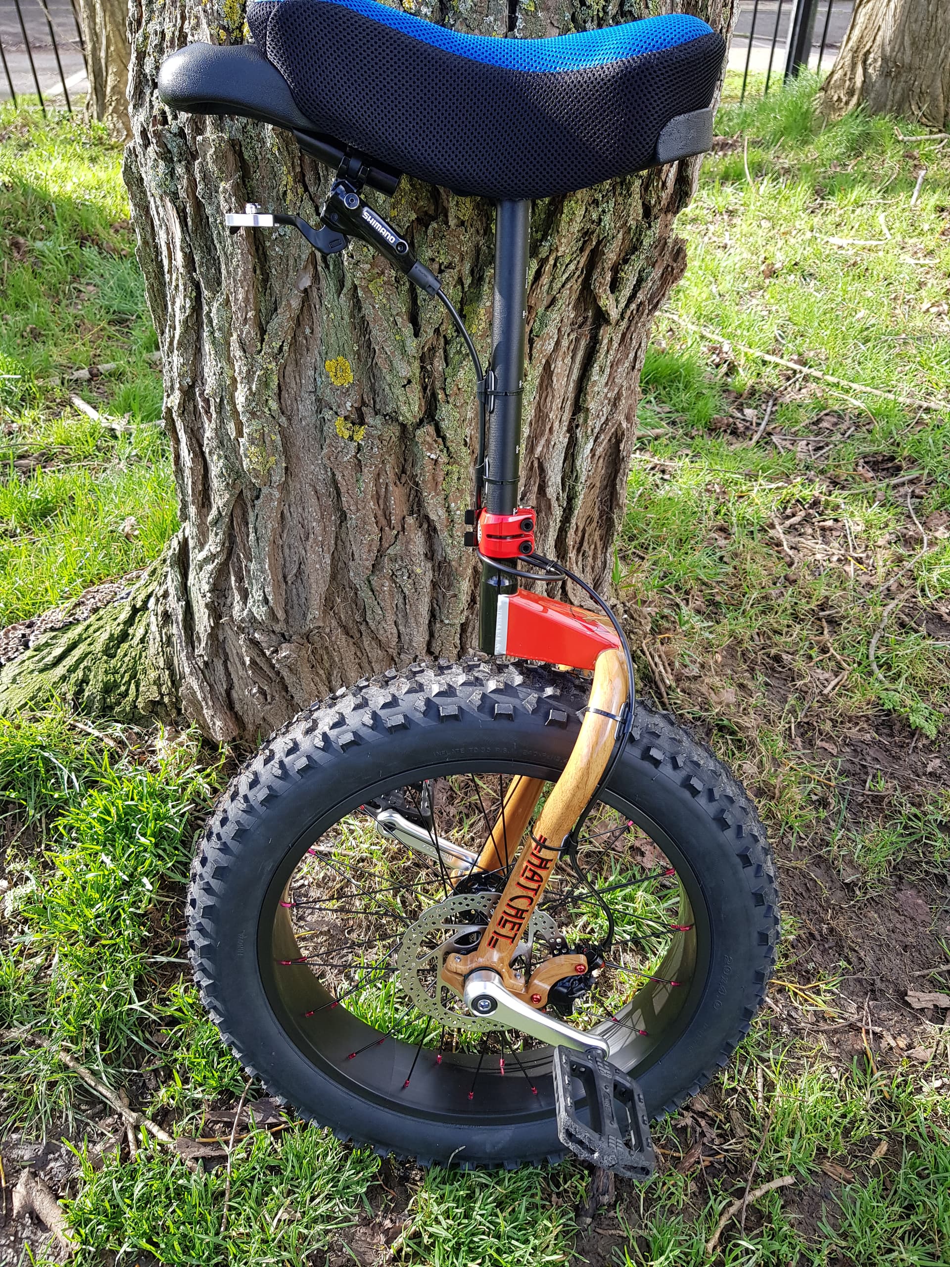 I recently rebuilt my 26 er by swapping out my heavier nimbus muni frame for an Oracle frame and swapped out my heavy 3 inch Duro wildlife for a lighter and less aggressive 2.5 inch maxis Holly roller. This uni allows me to ride mixed surfaces on the same ride, pavement, light trails, gravel and crushed lime stone. I have incorporated a kris holme t bar that I keep close to my saddle. This is my hybrid/ XC / gravel uni. I am not and never will be a single track muni rider so this set up is ideal for a nice mixed surfaces ride.