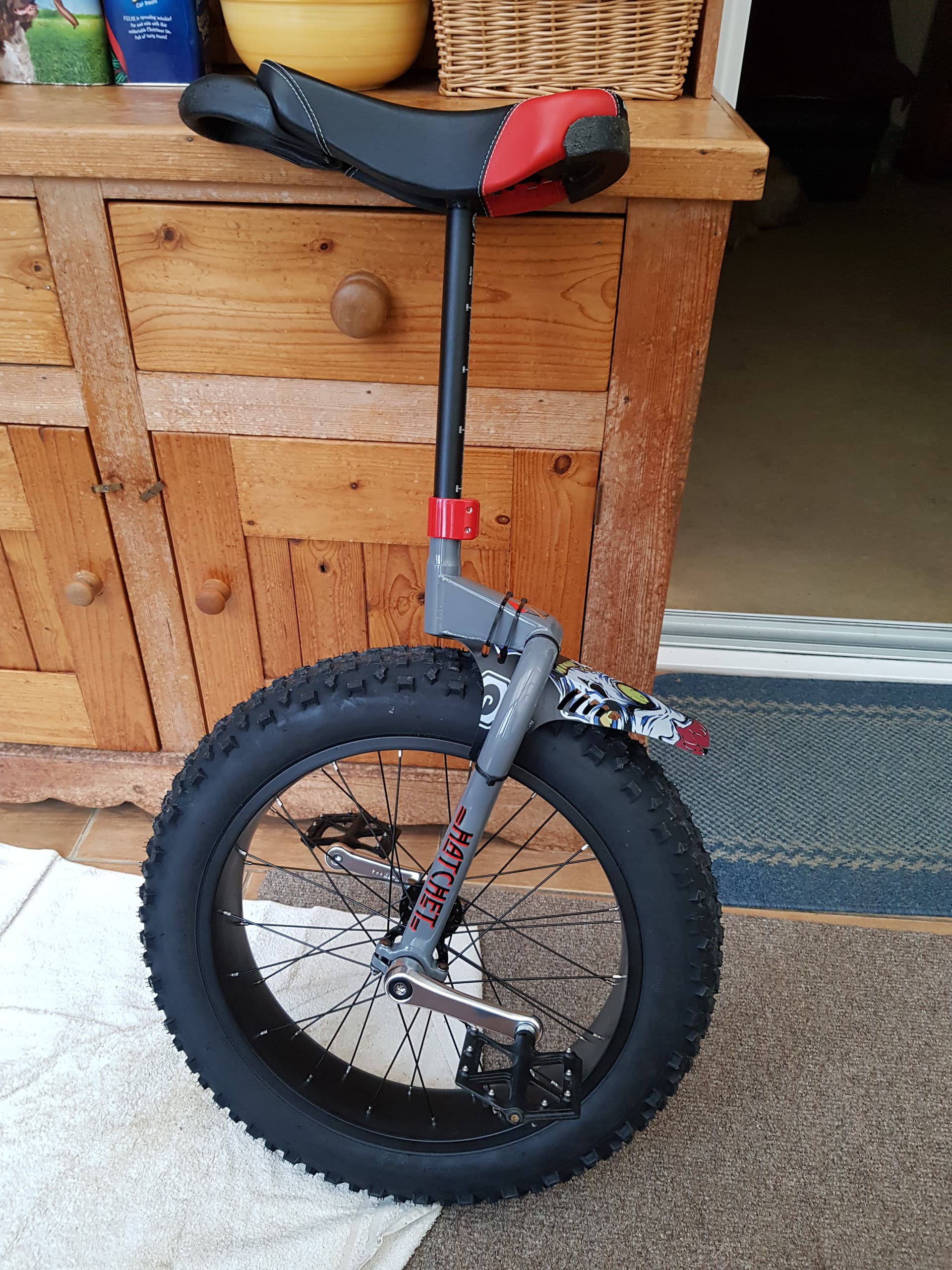 I believe my second uni was the KH26 municycle. It is much easier to ride on than a hatchet. Sure a hatchet is very easy to mount, but it has a lot of friction, which quickly tires you out, but of course you can just train for it.