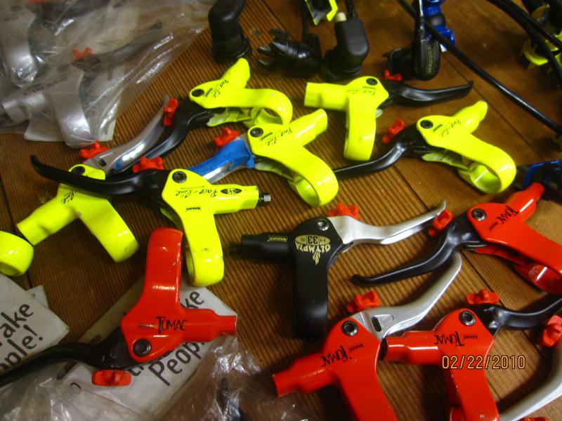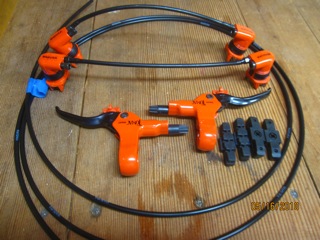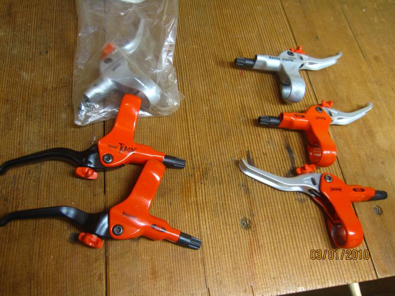 I started putting them together into sets for unicycles. Lots of colors from day-glo yellow to red to booring old silver and black. Comes with new black brake pads, brake line length and crossover lengths of your choice and I bleed and test them before I ship so they will be ready to mount on your unicycle right out of the box. All of these lever blades are KH spooner compatible.