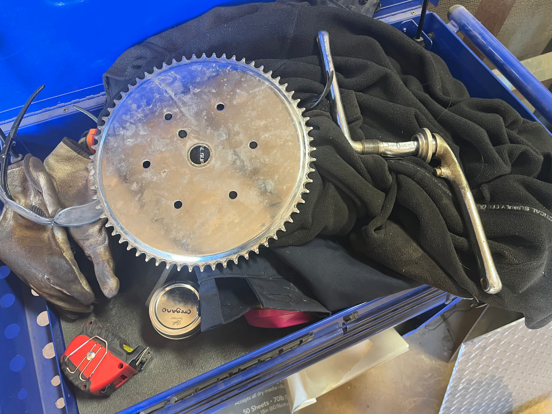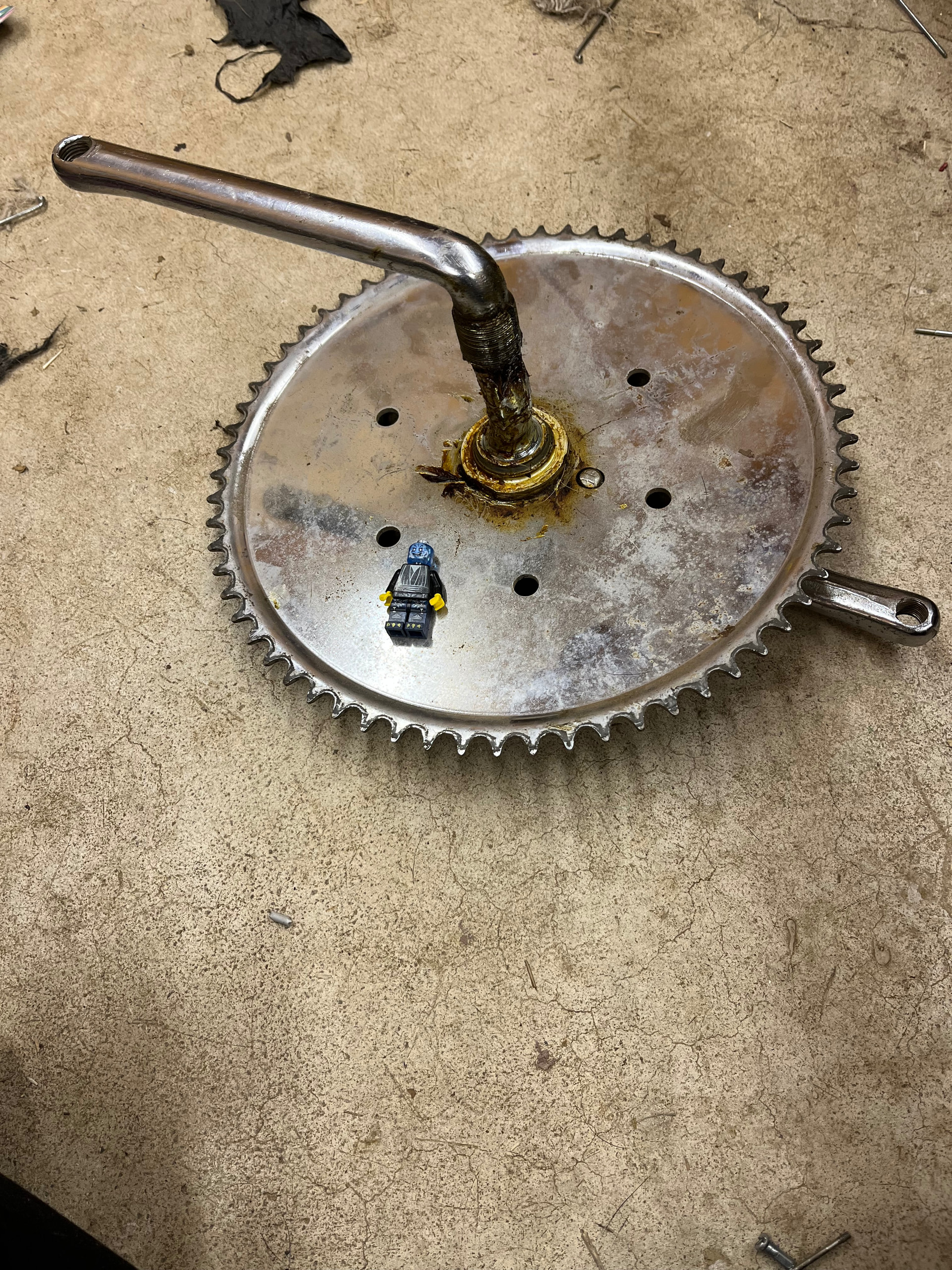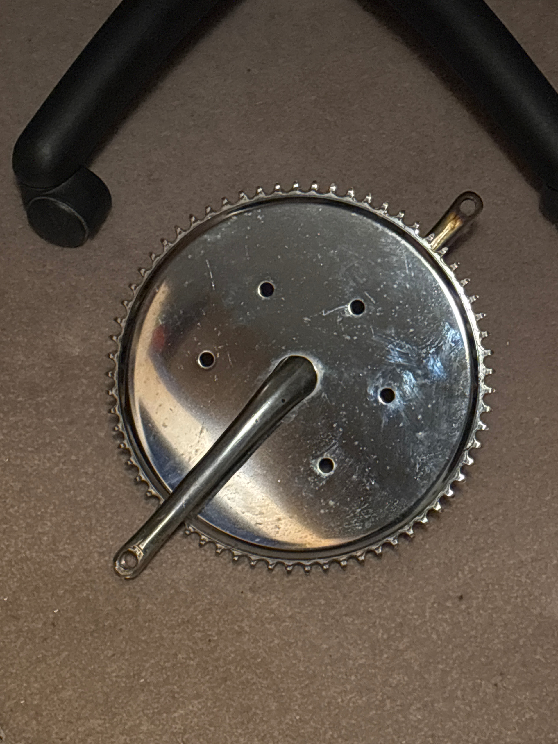 I love these big chrome dinner plates. I’m not sure if I’ll do a 12” giraffe or a small tall b*ke. An 11” 65t chainring would look funny with a 12” wheel in either case.