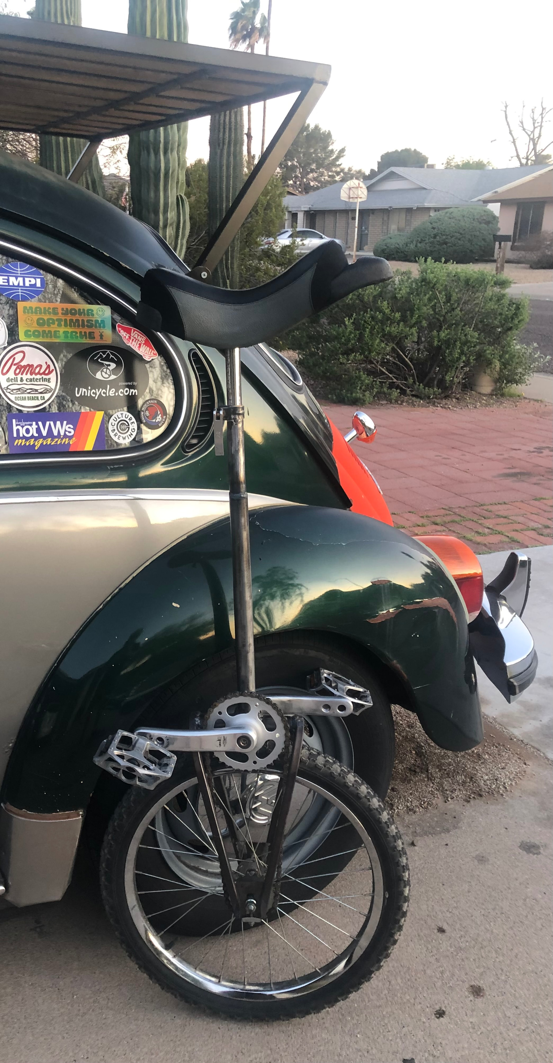 Penguins are fun. I built this one two years ago from scrap metal as an experiment. Shortest possible 20er giraffe unless I were to start cutting into the bb shell. In that picture it’s geared 32:20 making it into a 32er ratio wise. I later built a wheel for it with a 6 bolt 16tooth cog which makes it ride like a 40”. It has a chainring or cog eccentricity that makes it rather unpleasant to ride with the constant fluctuations in backlash. For that reason it sits in my closet until I feel like messing with it again. I have a couple clips of me riding it when it was 32:20 and a couple clips of some cal poly unicycle club members riding it as 32:16 although I’d have to figure out how to get them formatted in a way that the forum will allow me to upload.
