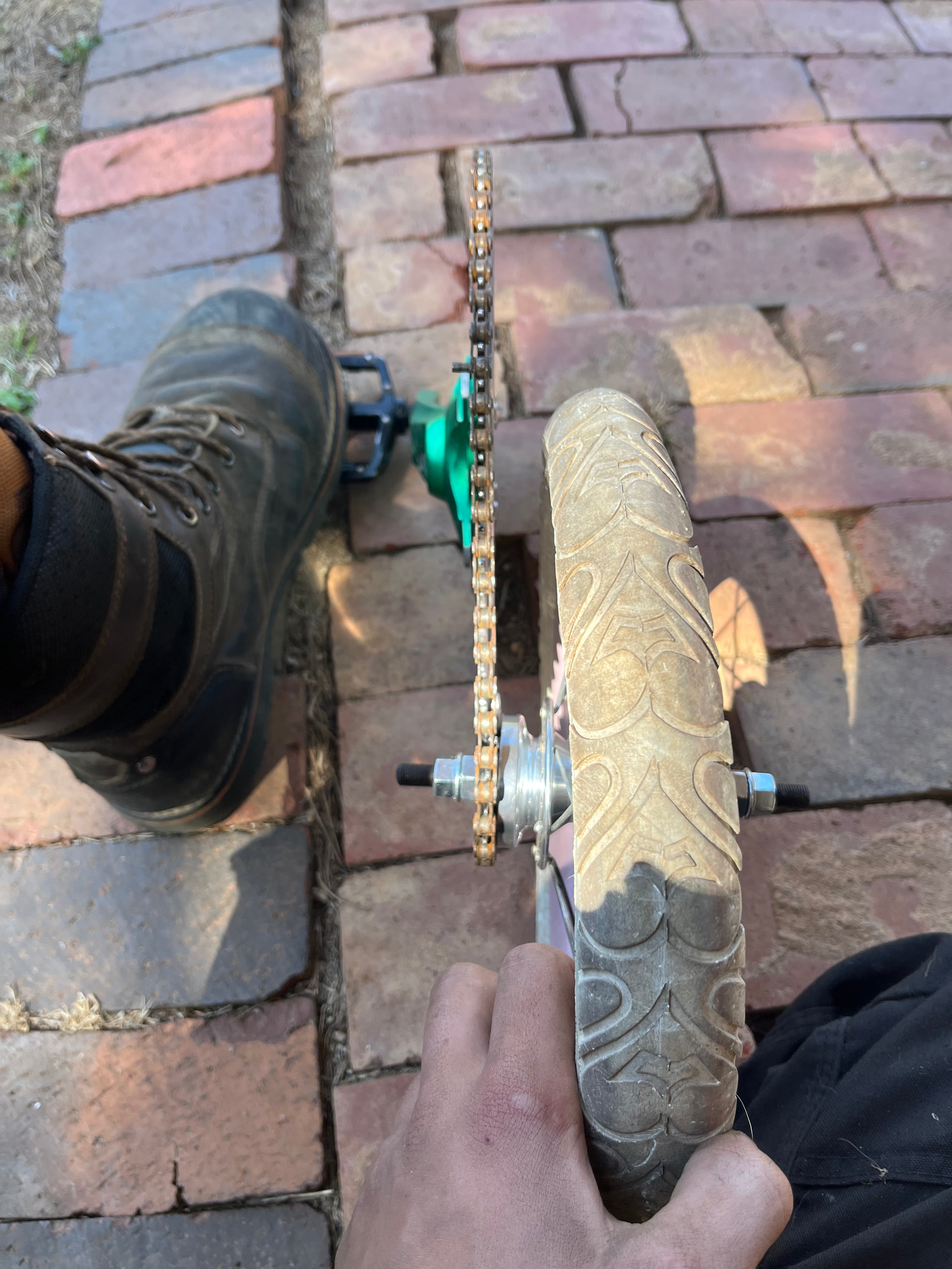 6” pneumatic scooter wheels do exist although I’m not sure you could find anything with means to bolt a sprocket on without modifying it. 8” pneumatic wheels can be had with a 6 bolt pattern on them. 8” is what’s on my clown bike pictured in a previous reply